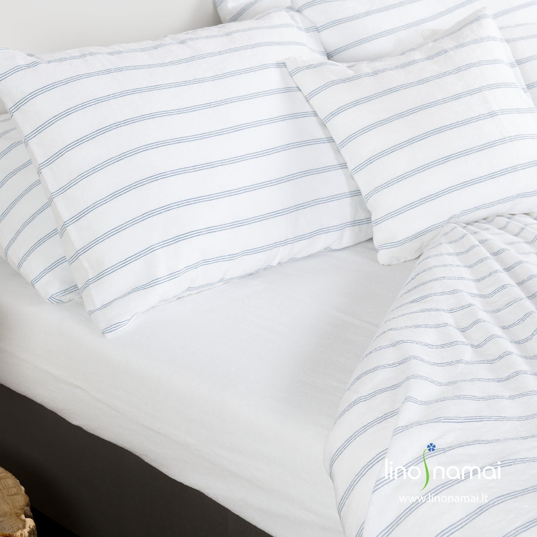 • Balta lininė paklodė prie patalynės mėlynais dryžiukais