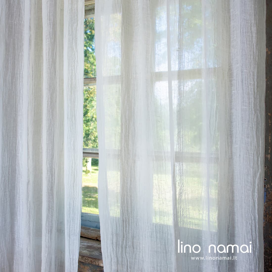 Pieno baltumo (gelsvai balta) lininė užuolaida pasiūta iš lengvo, reto, permatomo audinio. Speciali skalbimo technologija suteikė šiam gaminiui purią, nelygią, nerūpestingai pasiglamžiusią struktūrą ir ypatingą minkštumą. Tokio audinio užuolaidos labai gražiai žiūrėtųsi bohemiškame, skandinaviškame interjere, kuriame vyrauja natūralumas, ramios spalvos.