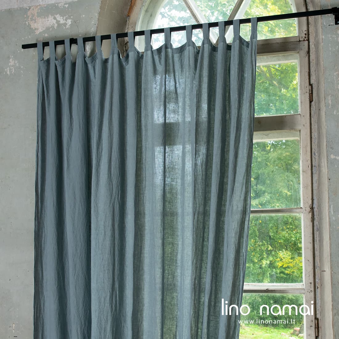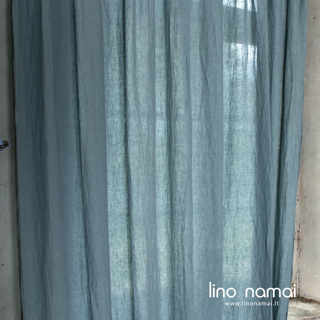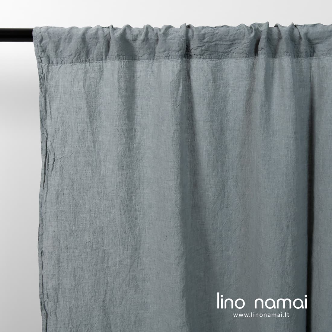Melsvai pilka lininė užuolaida iš specialiu būdu skalbto audinio. Šis skalbimas suteikė gaminio audiniui nepaprasto minkštumo, purumo, nelygų paviršių. Raminanti spalva, nerūpestingai pasiglamžiusi struktūra ir natūralus audinys - šios užuolaidos puikiai tiks miegamojo, svetainės kambariui papuošti. Užuolaidos plotis net 285cm - be vargo uždengsite didelių matmenų, nestandartinius langus.