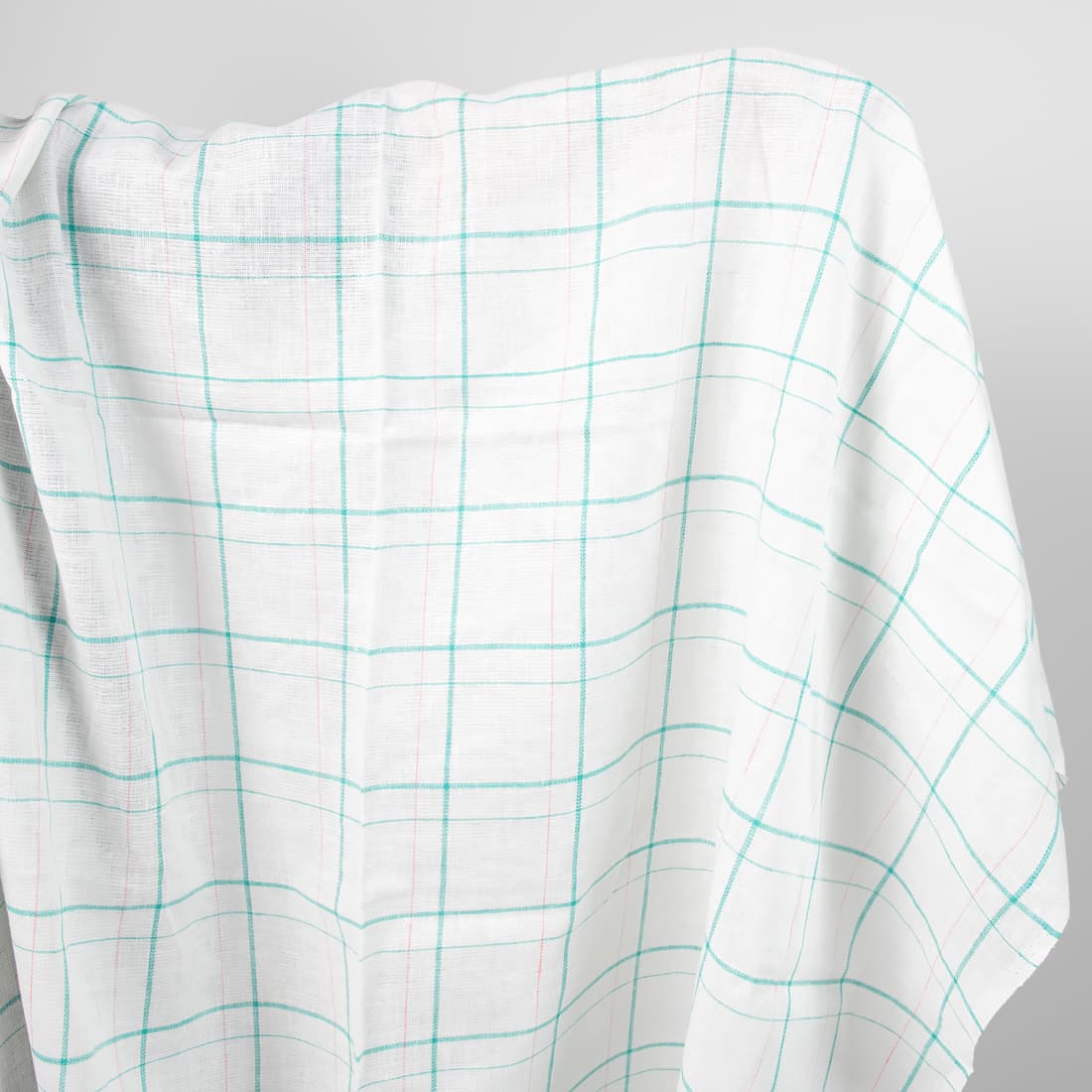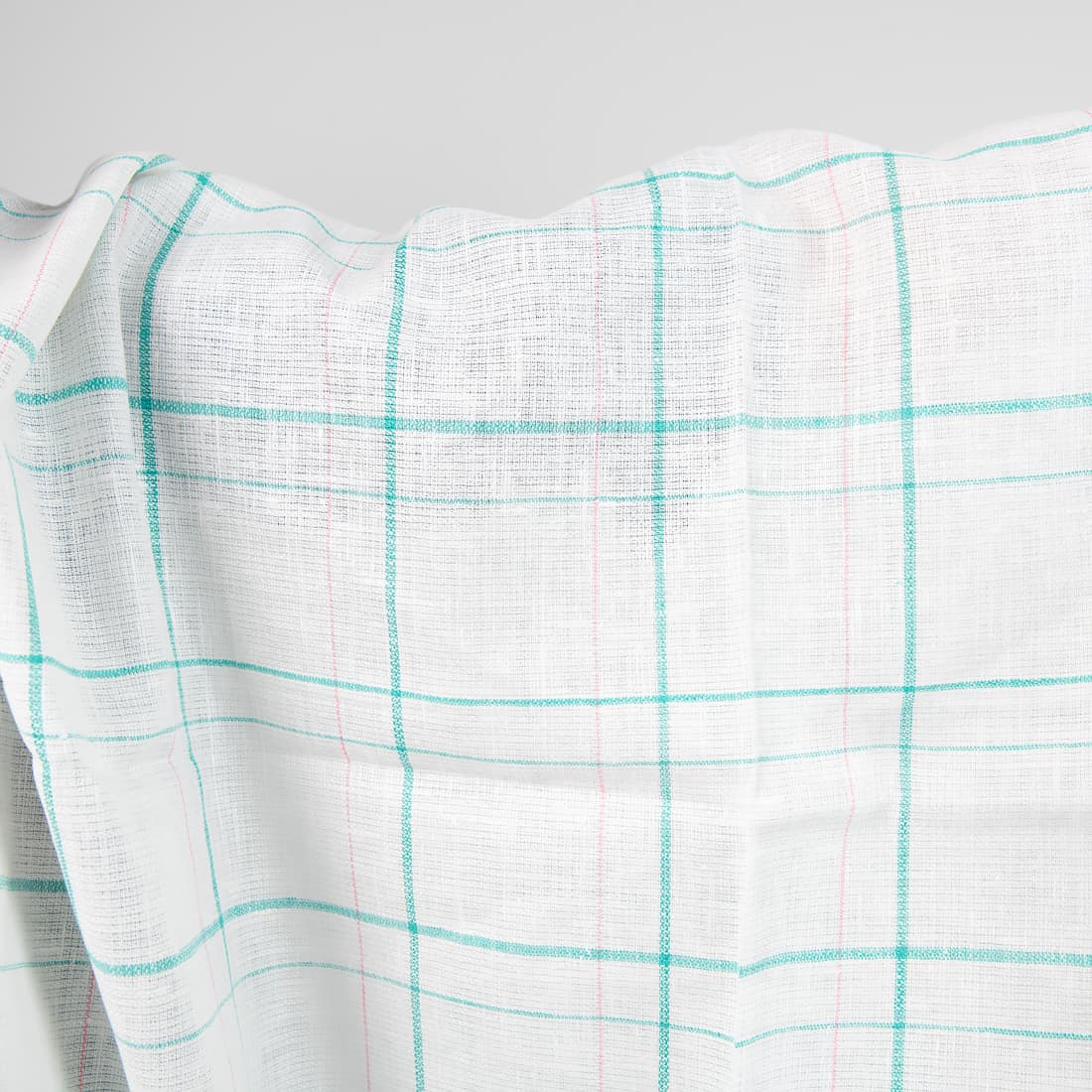 Baltas su žaliais langeliais lininis audinys