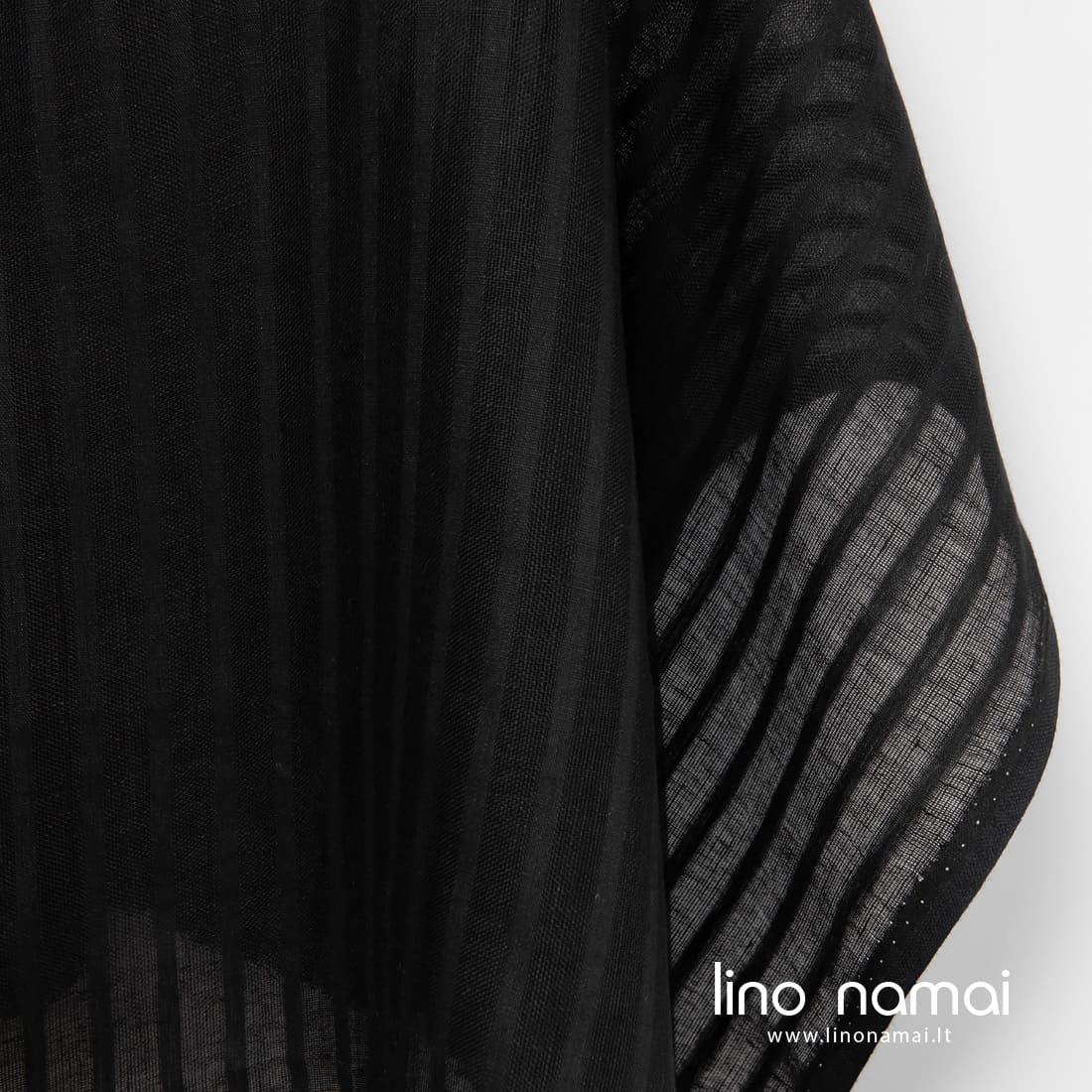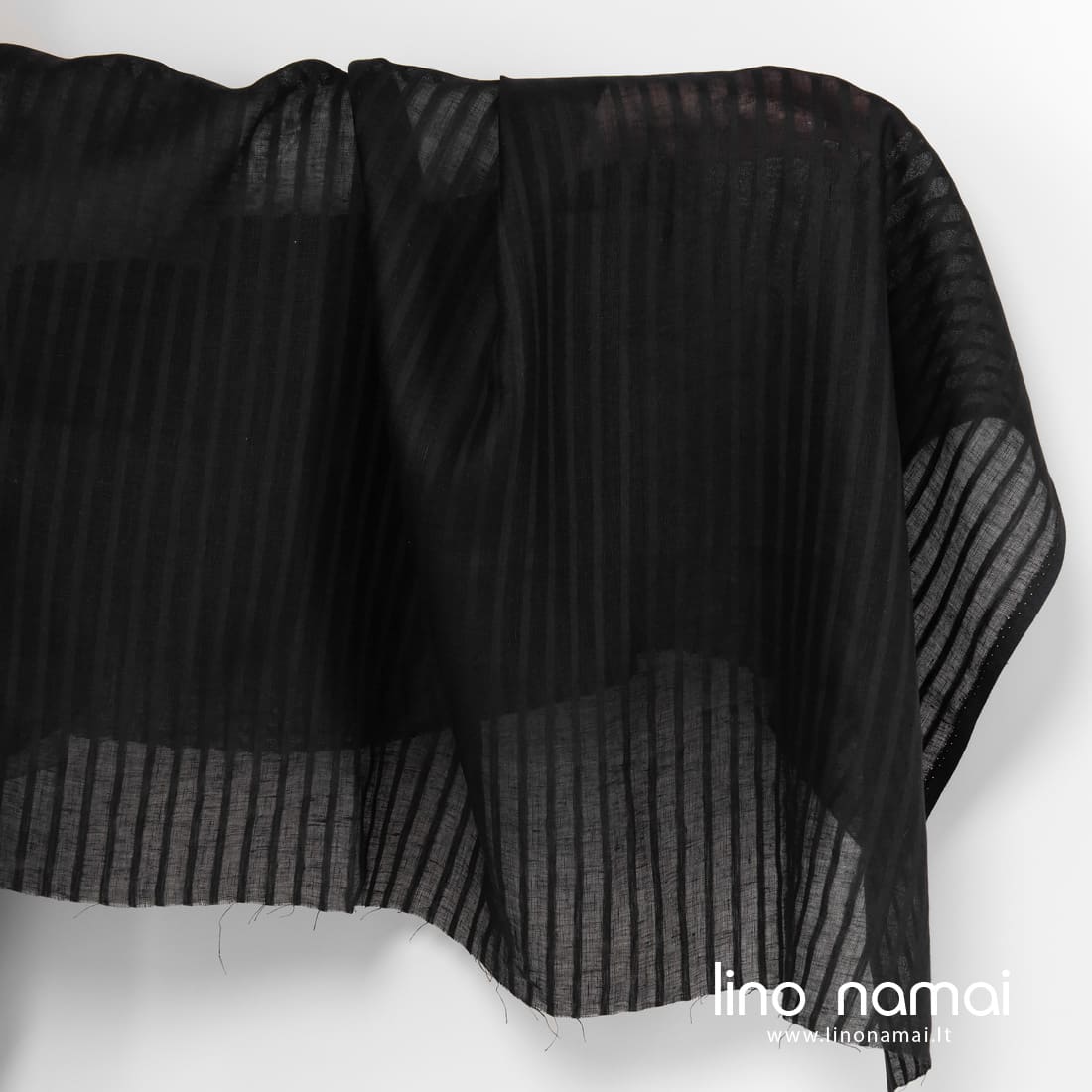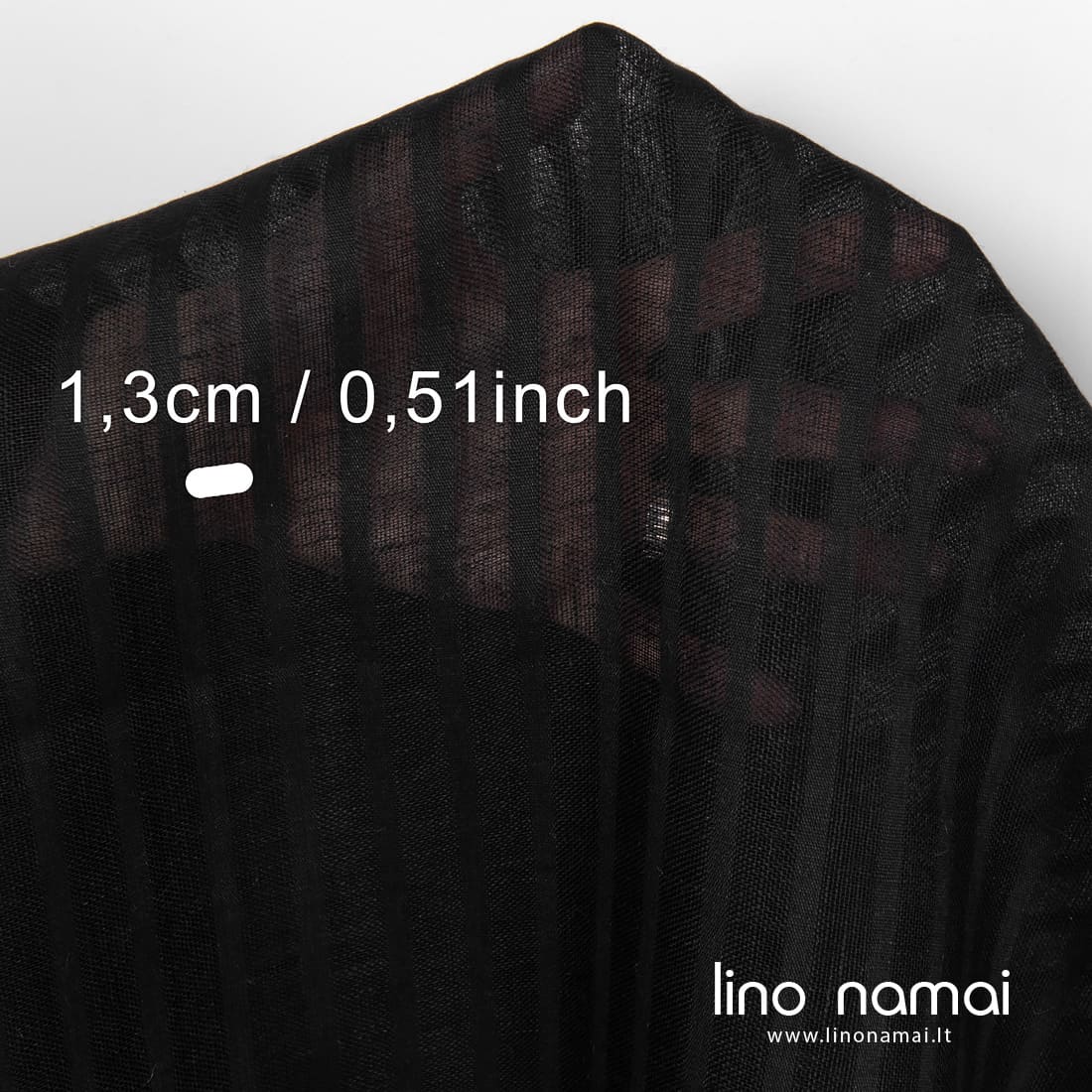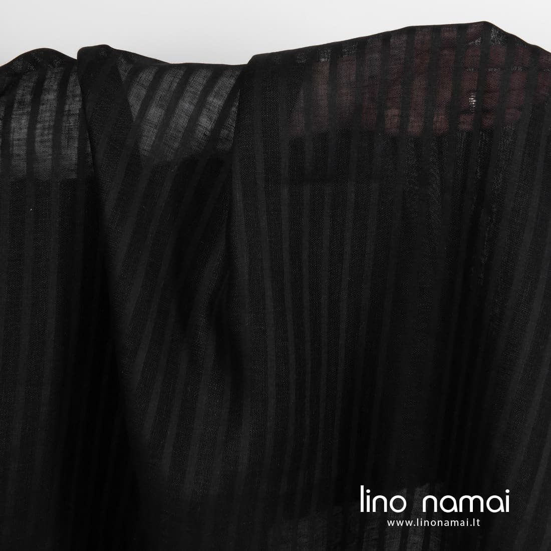 Juodas lininis audinys ažūrinėmis (permatomomis) vertikaliomis juostelėmis. Šis lengvas linas tinka šalikams, užuolaidoms siūti.