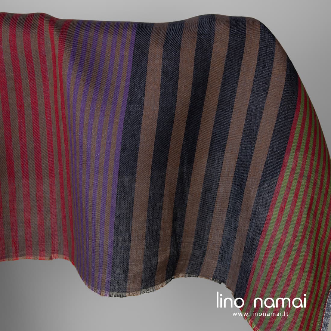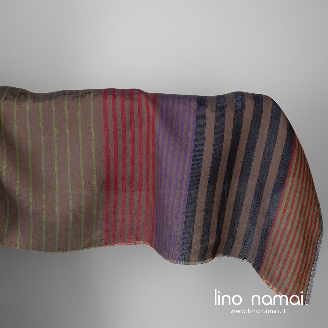 • Lininis audinys vertikaliais dryžiais išaustas iš juodų, rudų, šviesiai žalių, violetinių, mėlynai pilkų ir raudonų verpalų