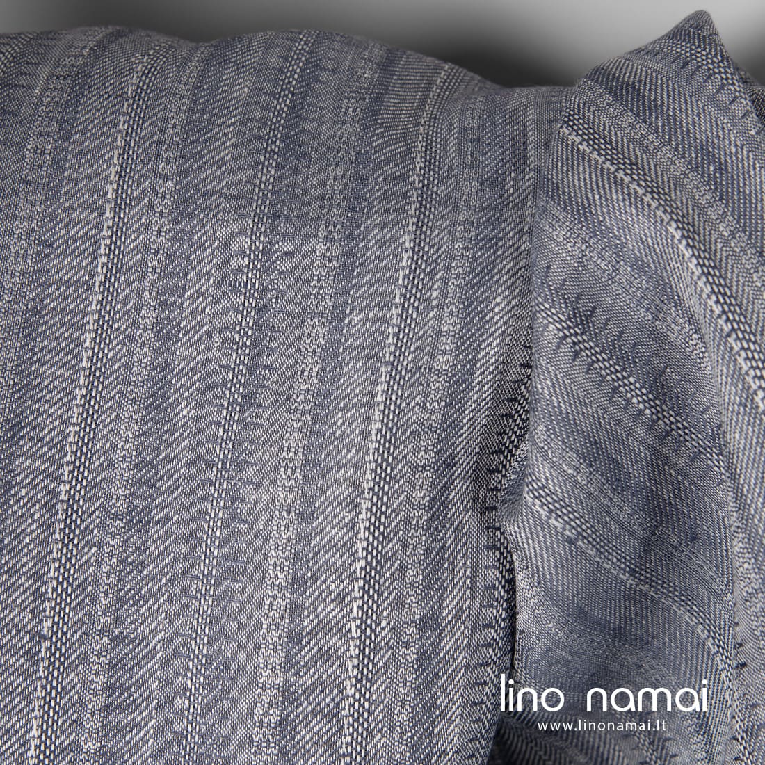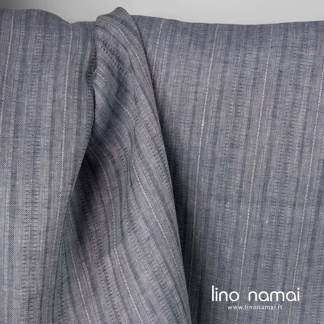Lininis audinys melsvai pilkas dryžuotas. Vertikalūs raštuoti dryžiai audinyje išausti iš melsvai pilkų ir baltų verpalų. Šis linas tinka namų tekstilei ir drabužiams siūti.
