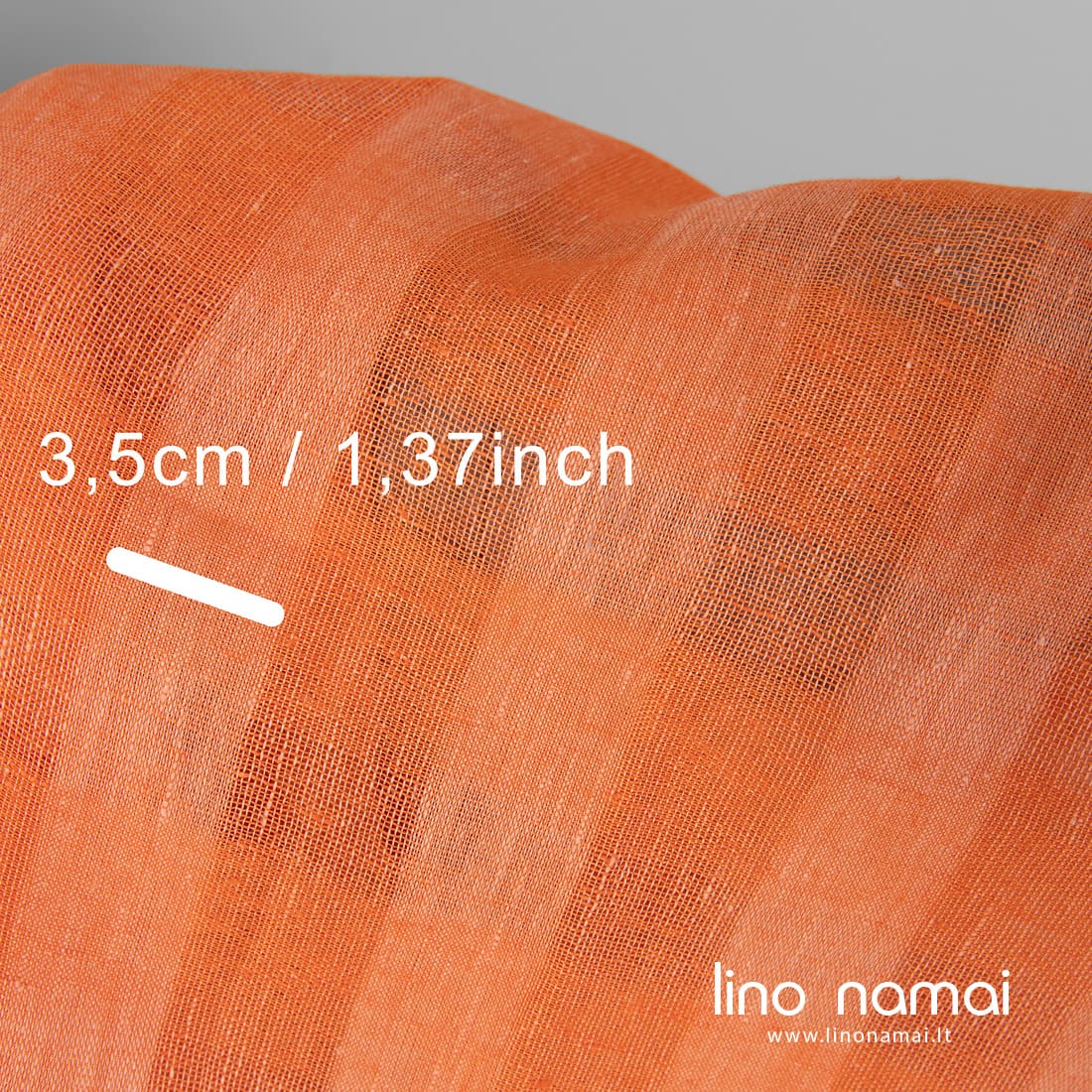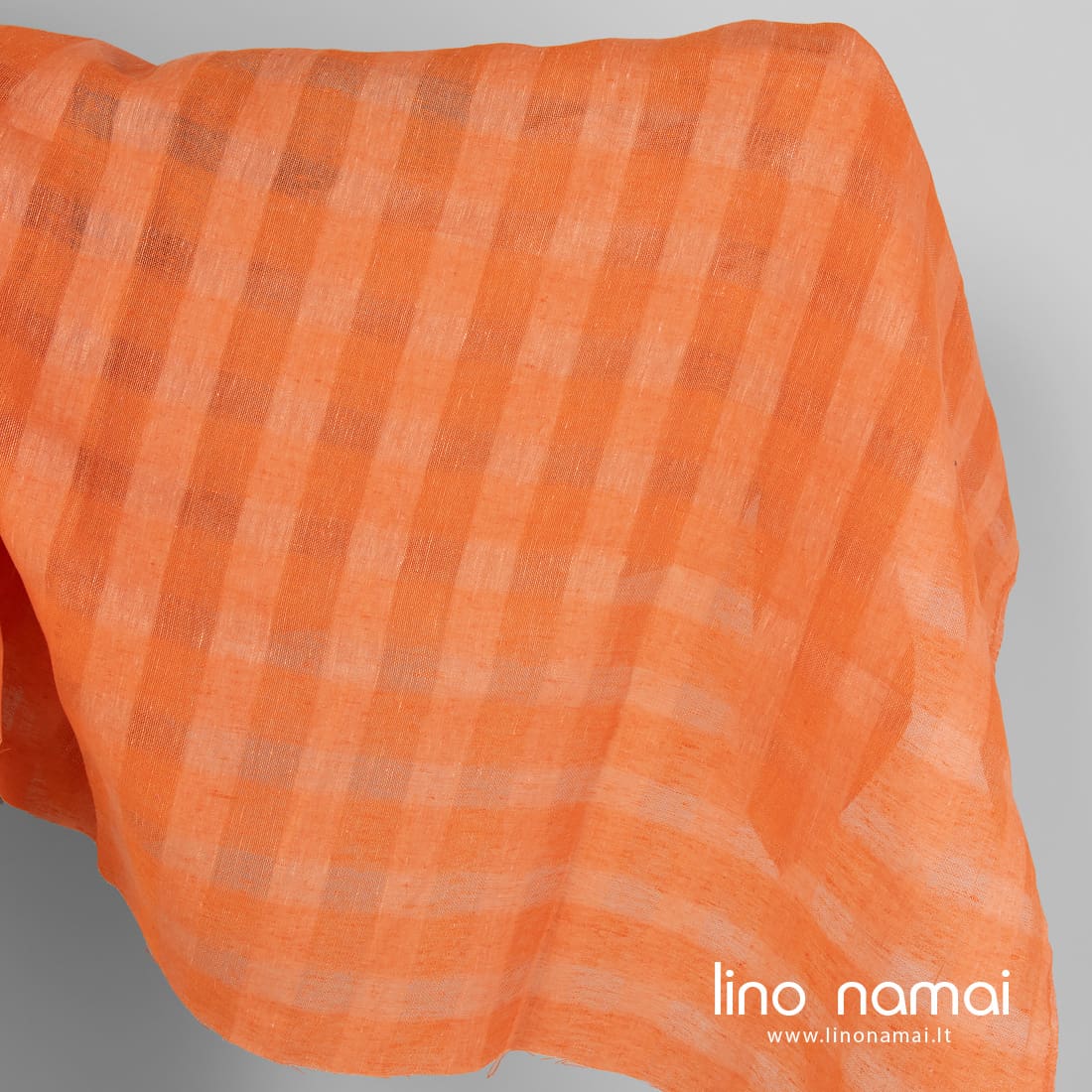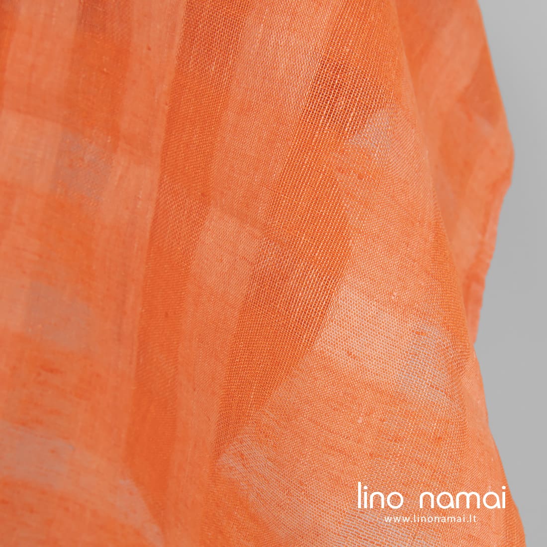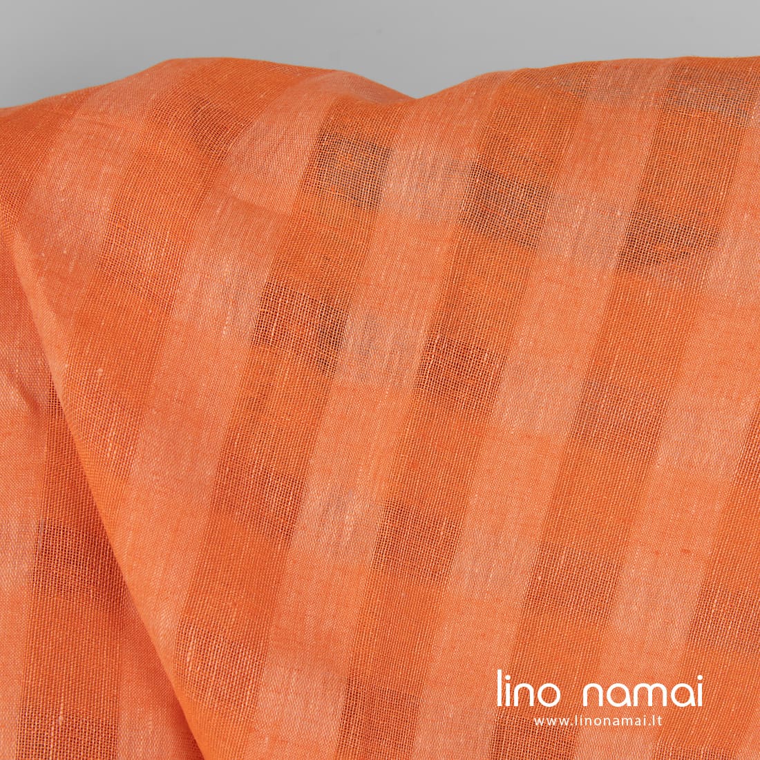 Lininis audinys oranžinis permatomas languotas, išaustas vertikaliomis retomis ir tankesnėmis juostomis, sudarančiomis langelius, prie oranžinių verpalų derinant persiko spalvos (rausvai oranžinius) verpalus. Tinka užuolaidoms, šalikams siūti.