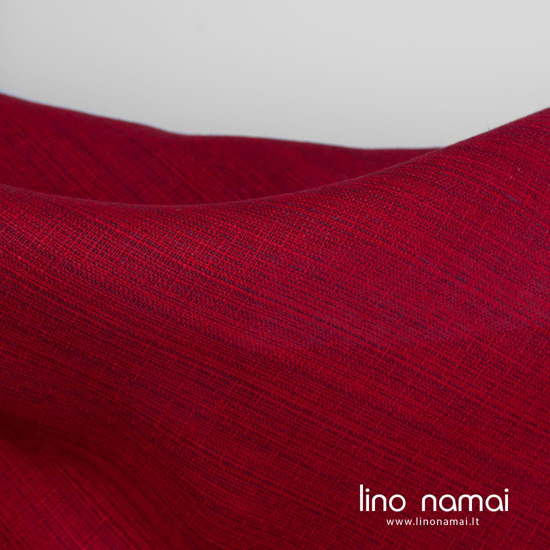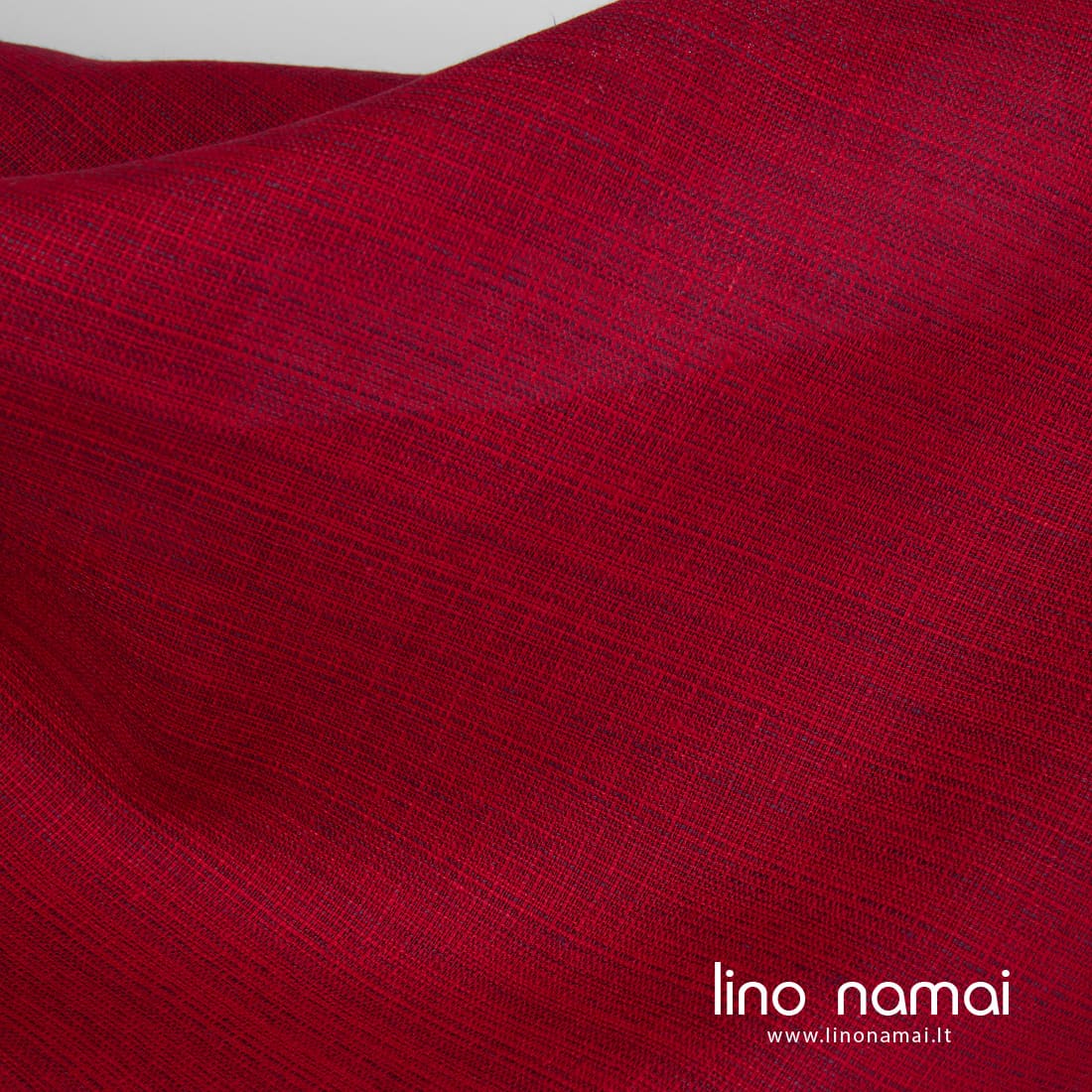 Lininis audinys raudonas melanžinis. Jame suaudėme ryškiai raudonus ir violetinius verpalus. Šis linas tvirtas, tankus, vidutinio storio, tinka drabužiams, namų tekstilei siūti.