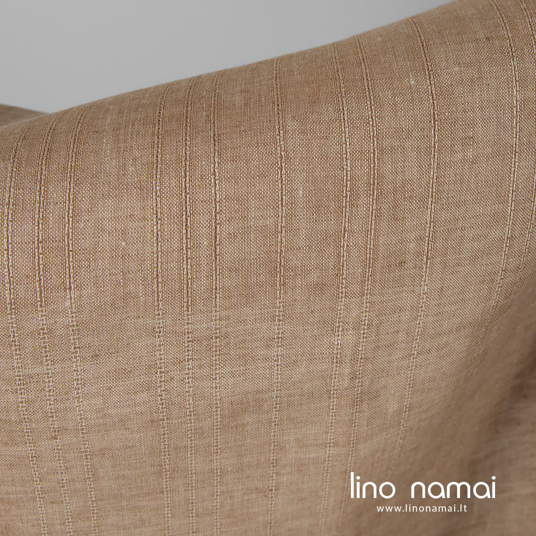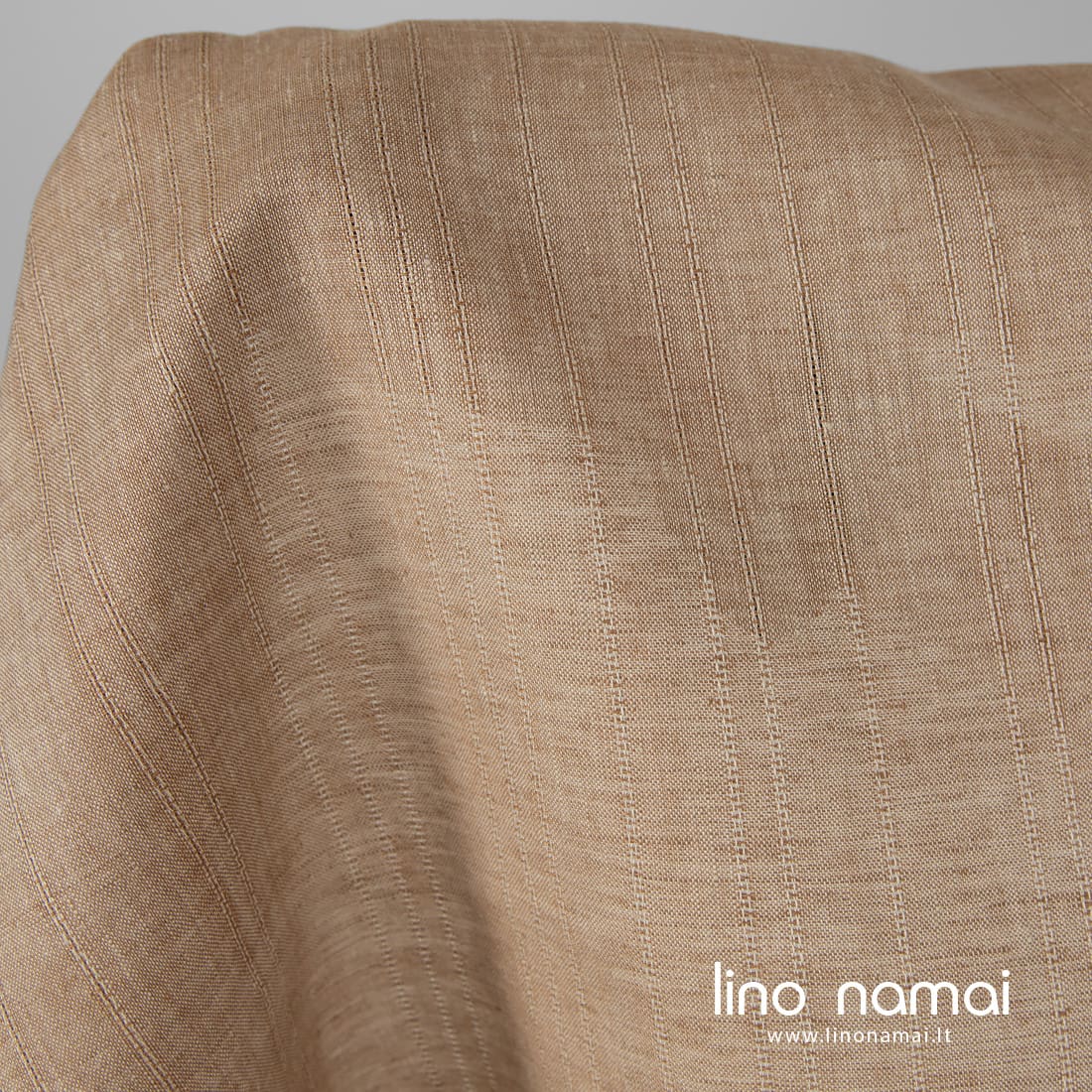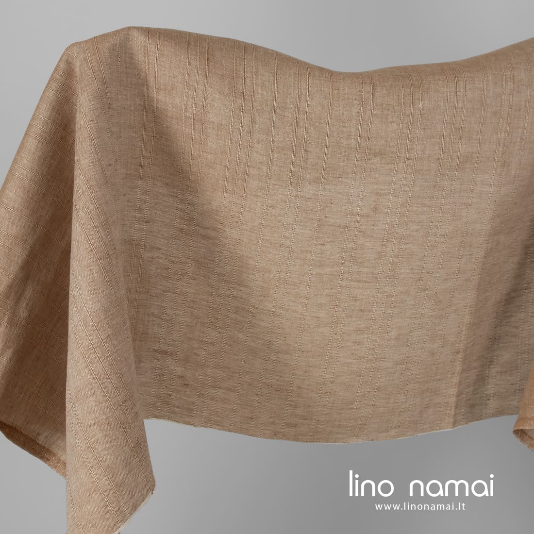 Lininis audinys rudas melanžinis, išaustas derinant rudus verpalus su smėlio spalvos (šviesiais gelsvai rusvais) verpalais, pagyvintas vertikaliais ažūriniais dryžiukais. Tvirtas, tankus, lengvas, vidutinio storio.