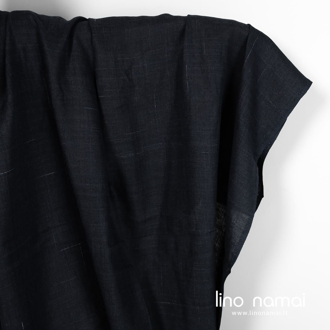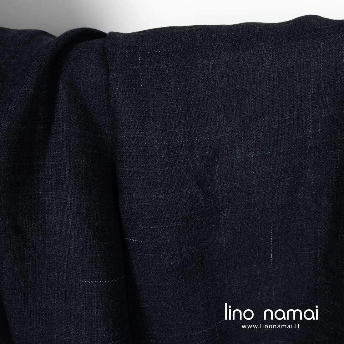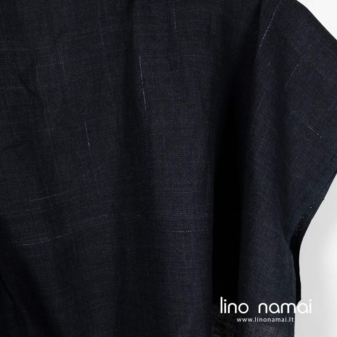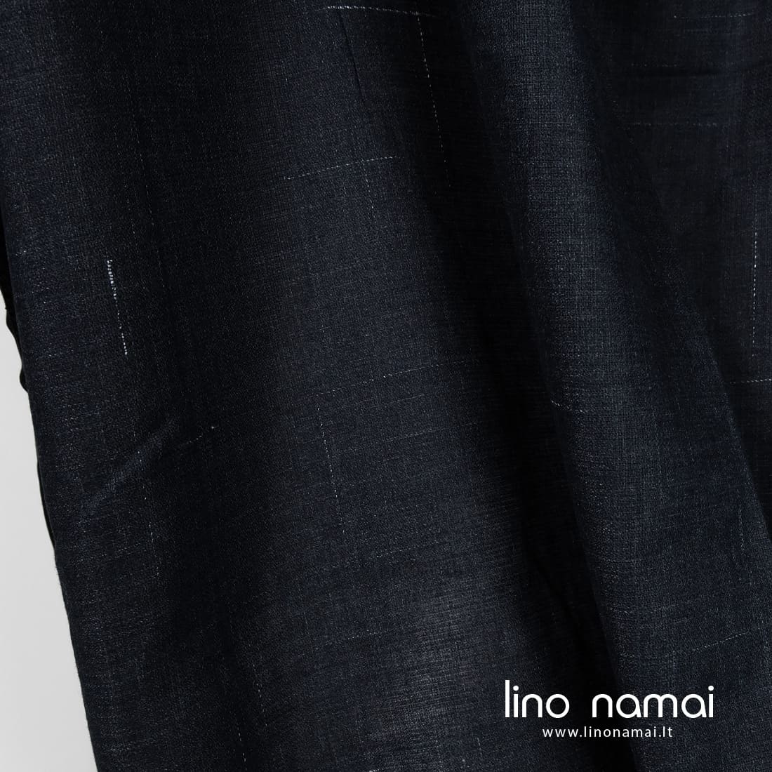Lininis audinys tamsiai mėlynas atsitiktiniais baltais poliesterio dryžiukais yra tvirtas, tankus, vidutinio storio. Tinka drabužiams ir namų tekstilei (staltiesėms, servetėlėms, užuolaidoms, prijuostėms) siūti.