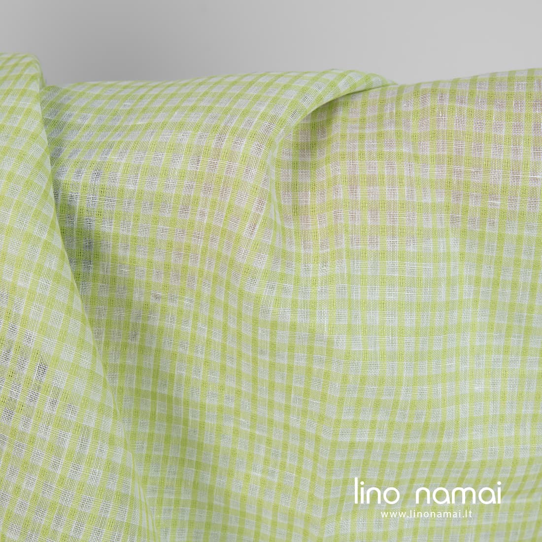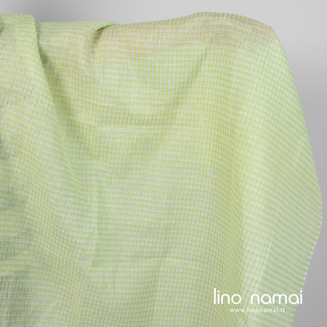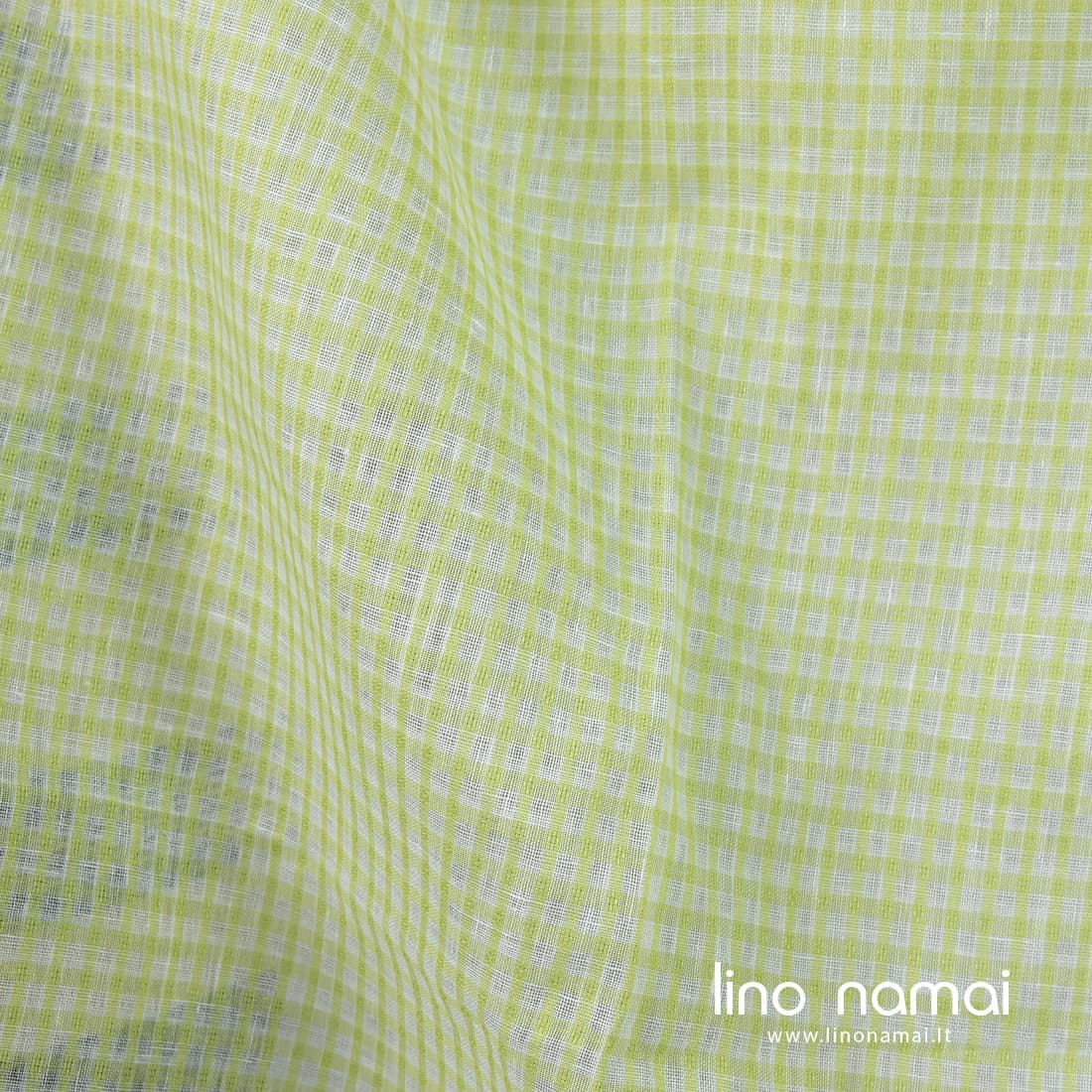 • Lininis audinys žalsvais permatomais langeliais tinka drabužiams ir namų tekstilei siūti