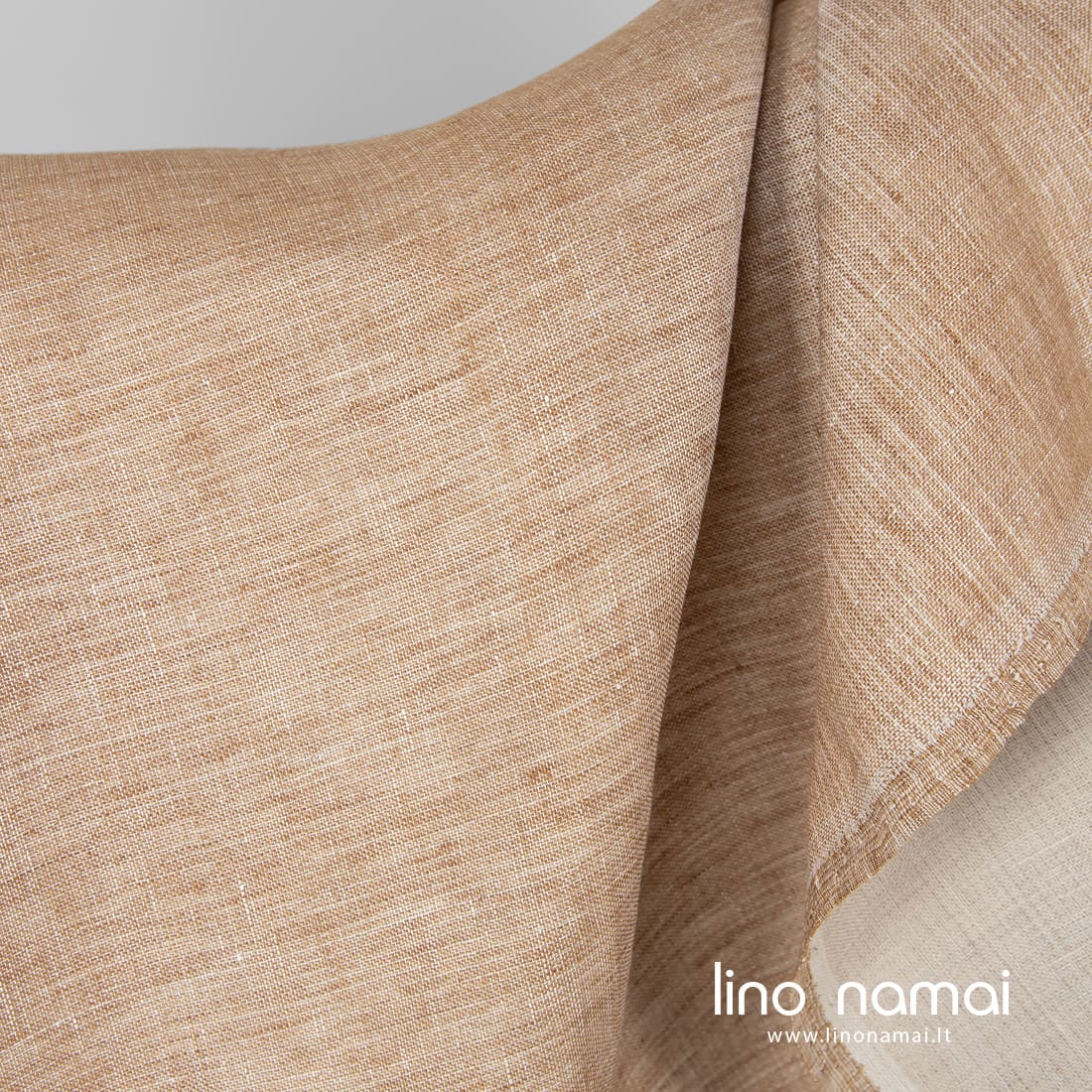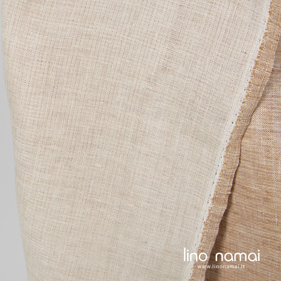 Lininis dvipusis rudas audinys: viena pusė šviesiai ruda, kita pusė smėlio spalvos (šviesi gelsvai rusva). Šis linas tvirtas, tankus, vidutinio storio, dvisluoksnis. Siuviniams galima naudoti abi audinio puses.