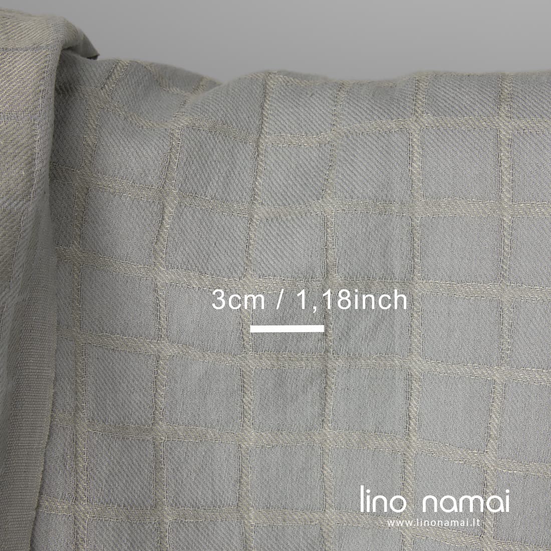 Languotas žakardinis audinys, austas iš melsvai pilkų medvilnės ir šviesiai pilkų lino verpalų įstrižais ruoželiais. Tankus, minkštas, švelnus, nes skalbtas pramoniniu būdu. Iš šio puslininio audinio pasiūti gaminiai skalbiami nesitrauks.