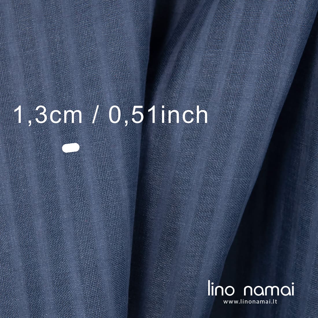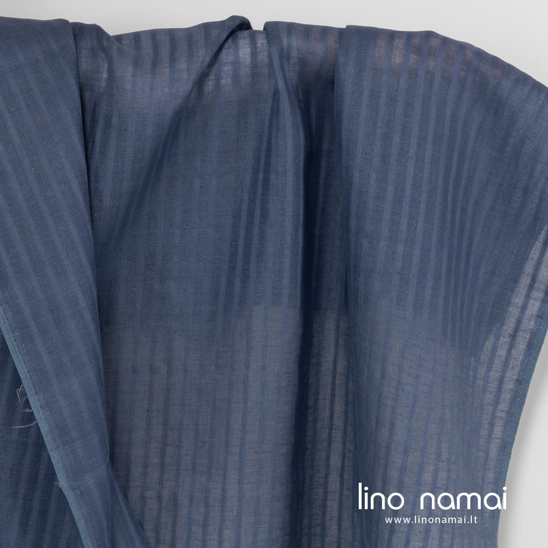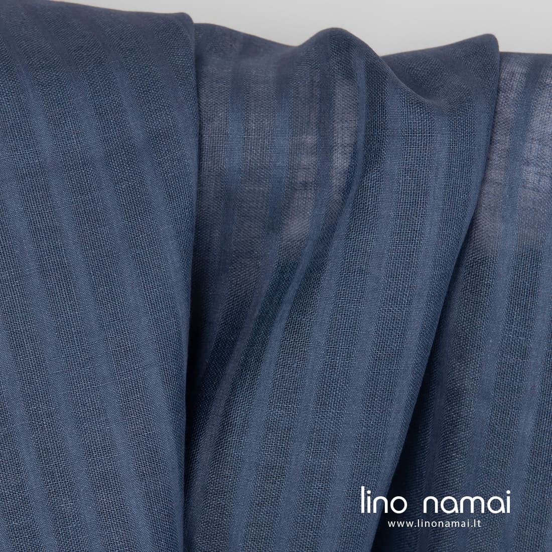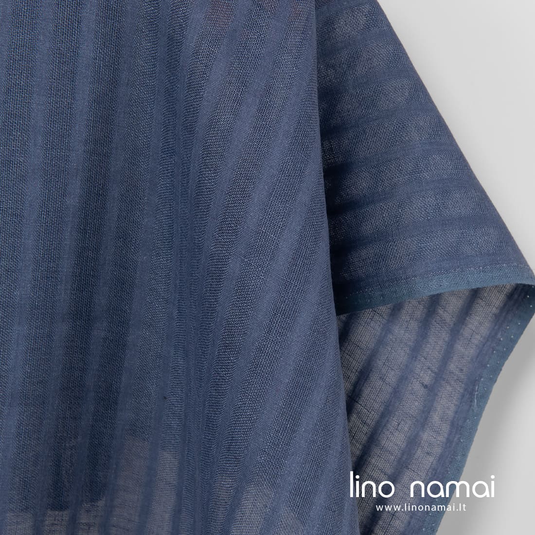 Mėlynas lininis audinys ažūrinėmis (permatomomis, retomis) juostelėmis, išaustomis audinyje vertikaliai. Šis lengvas linas tinka užuolaidoms, šalikams, staltiesėms siūti.