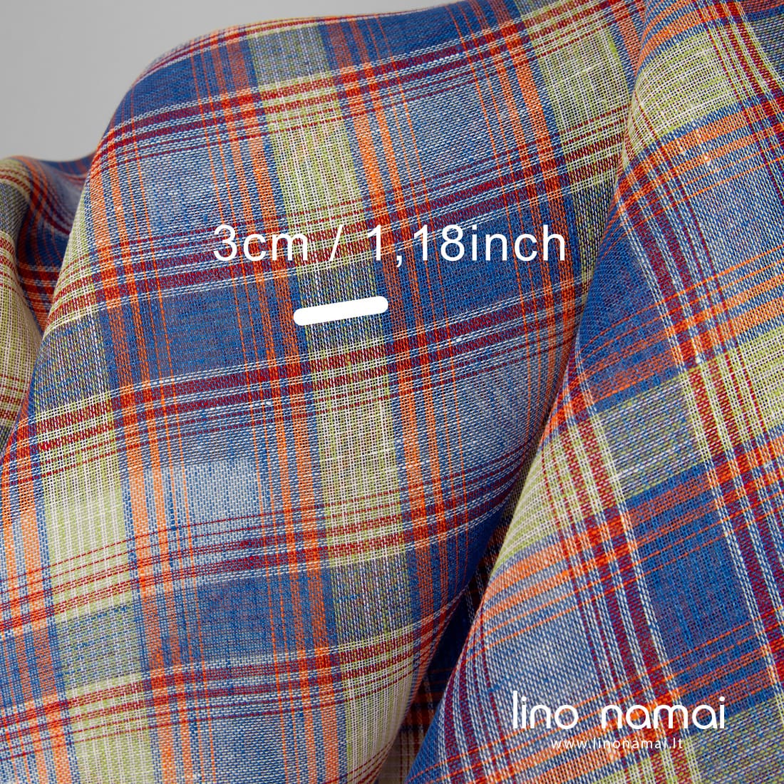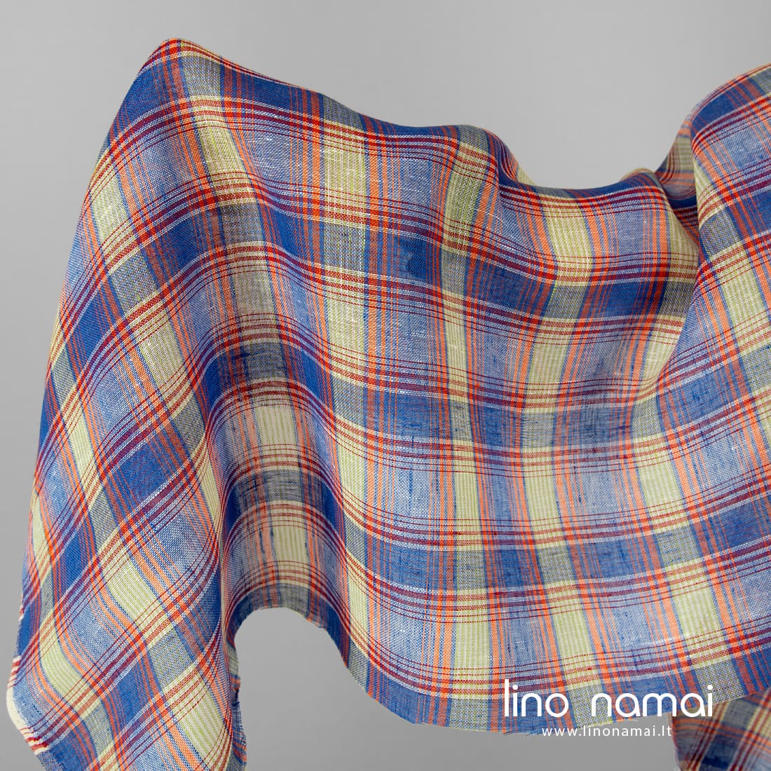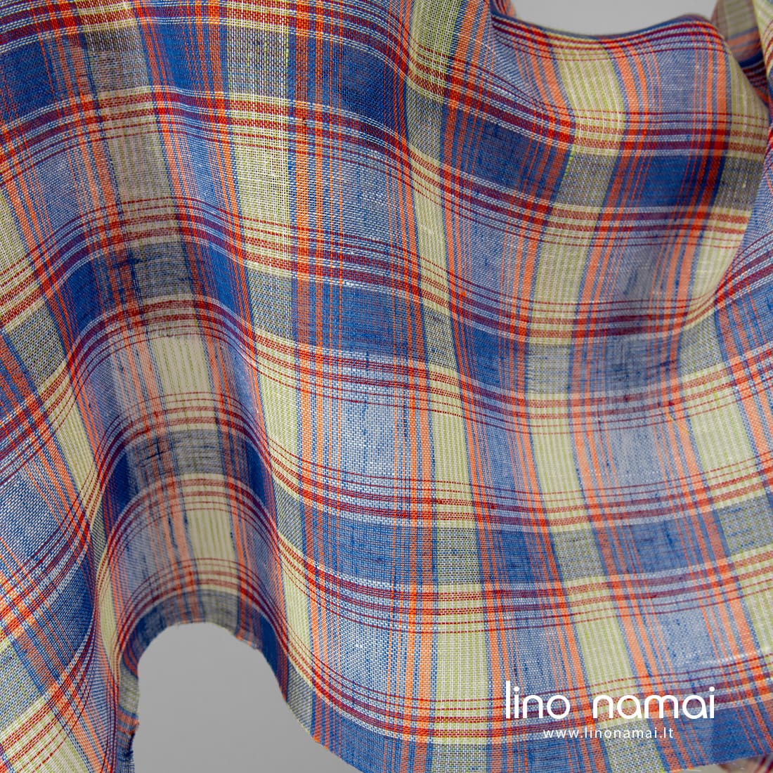 Permatomas lininis audinys mėlynais, oranžiniais langeliais, išaustais iš mėlynų, oranžinių, žalsvų, pieno baltumo (gelsvai baltų), skaisčiai raudonų, mėlynai violetinių verpalų. Lengvas, retas, tinkamas užuolaidoms, šalikams siūti.