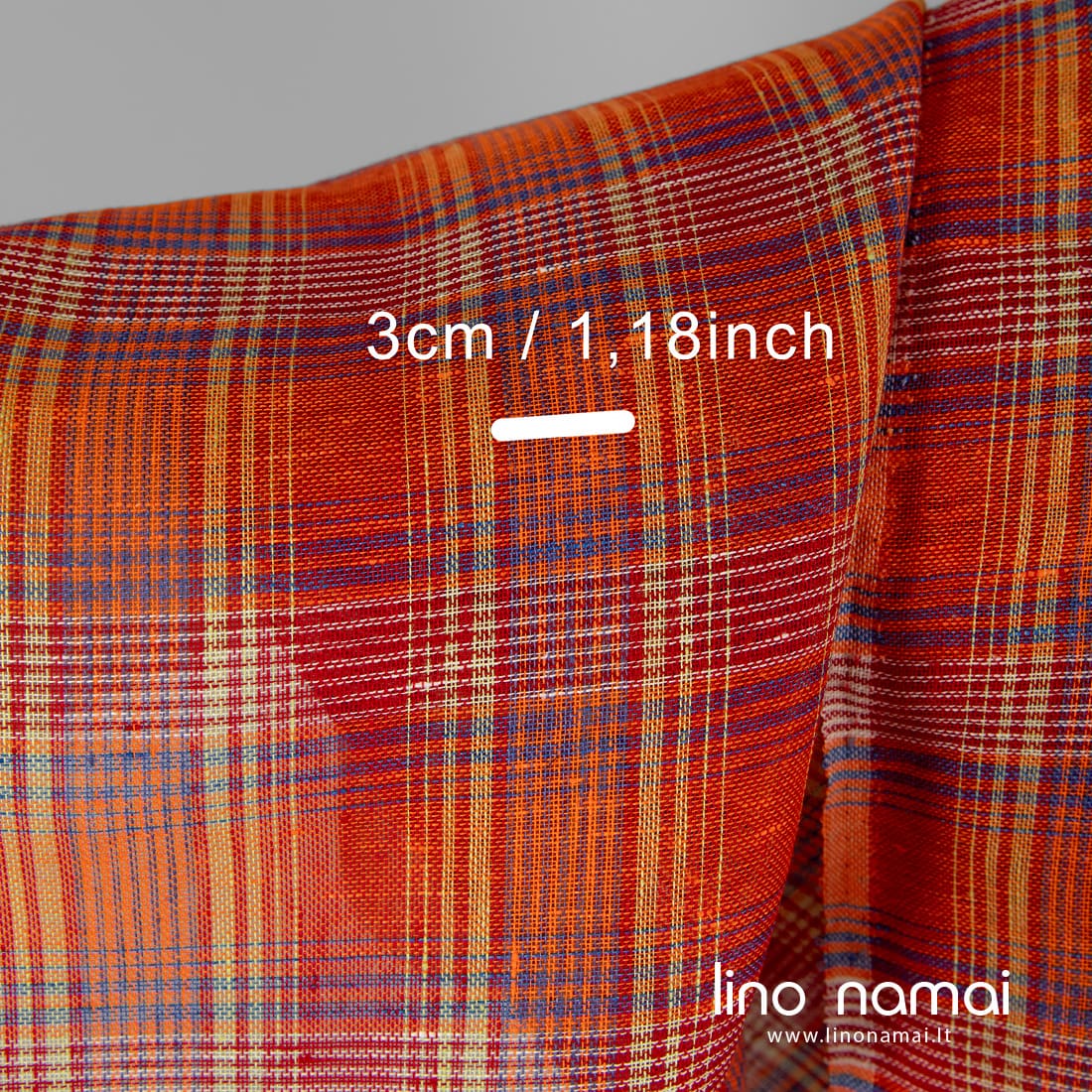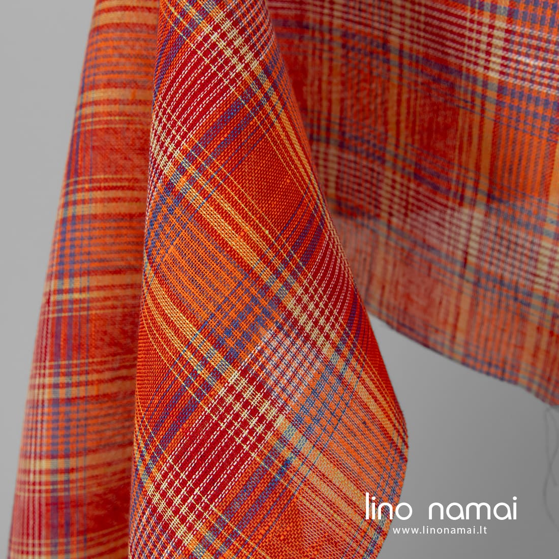 Permatomas lininis audinys raudonais, oranžiniais langeliais, išaustais iš skaisčios raudonos, ryškiai oranžinės, gaiviai žalios, mėlynai violetinės, mėlynos ir baltos spalvos verpalų. Lengvas, retas, tinkamas užuolaidoms, šalikams siūti.