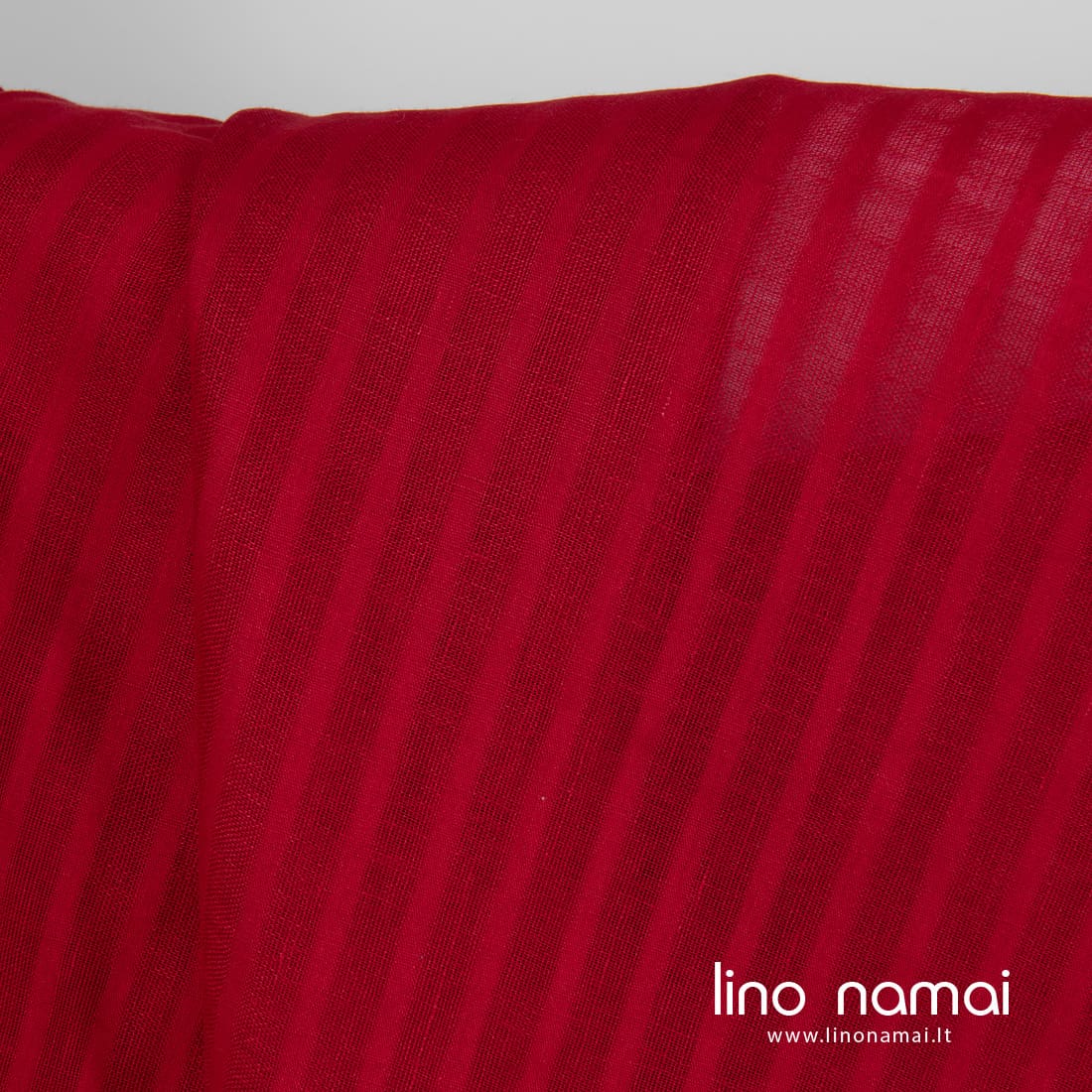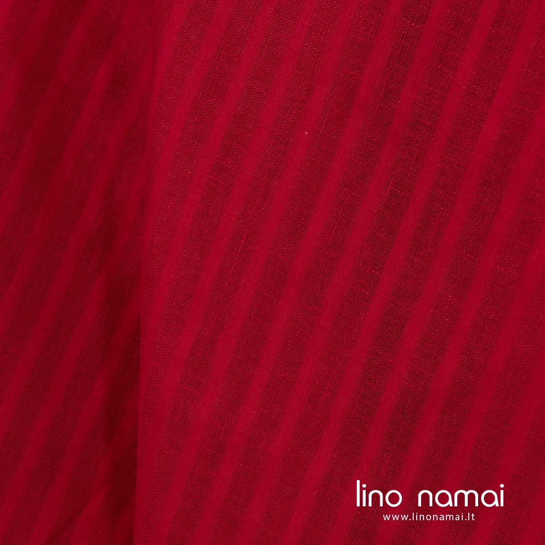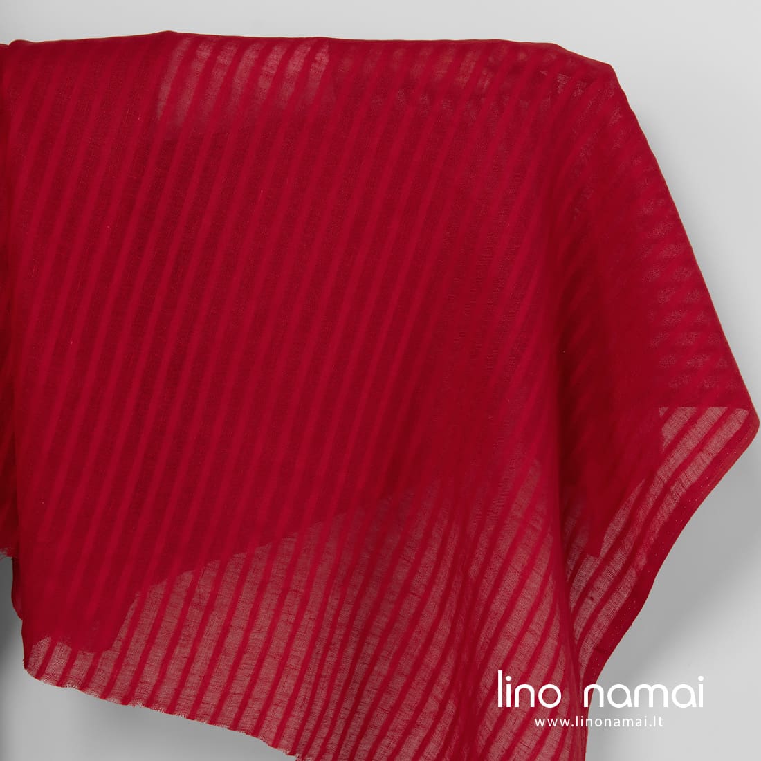 Raudonas lininis audinys ažūrinėmis juostelėmis. Tankios ir retesnės, permatomos juostelės audinyje išaustos vertikaliai. Šis lengvas linas tinka užuolaidoms, šalikams, skaroms, staltiesėms siūti.