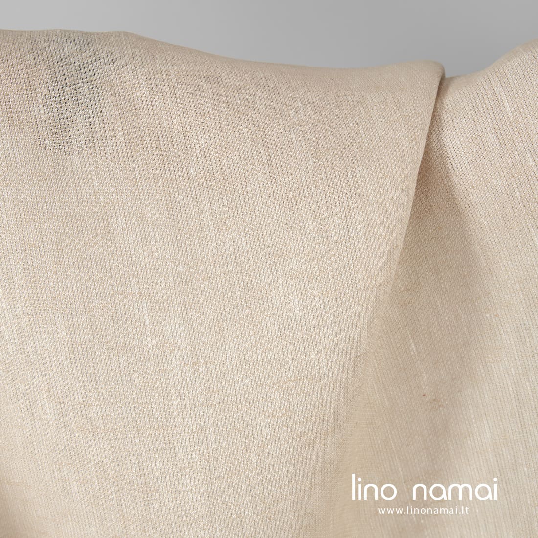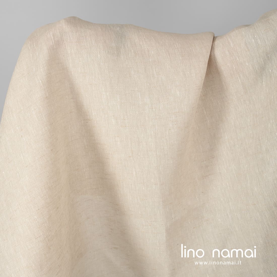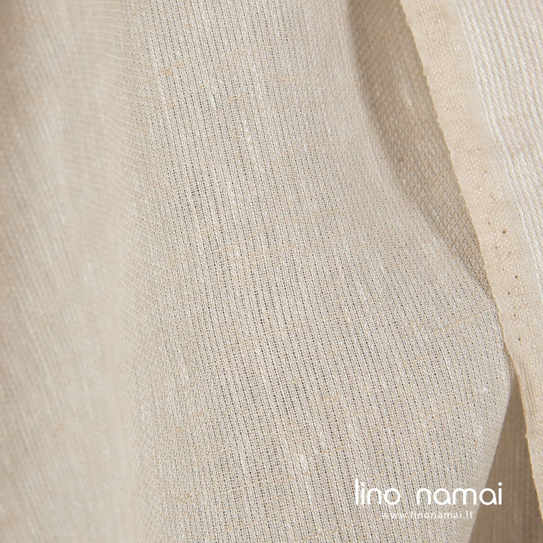 Smėlio spalvos raštuotas lininis audinys, išaustas vertikaliais dryžiukais iš baltų ir rusvų verpalų. Tvirtas, tankus, vidutinio storio. Iš šio 100% lino audinio galima siūti drabužius, namų tekstilę.
