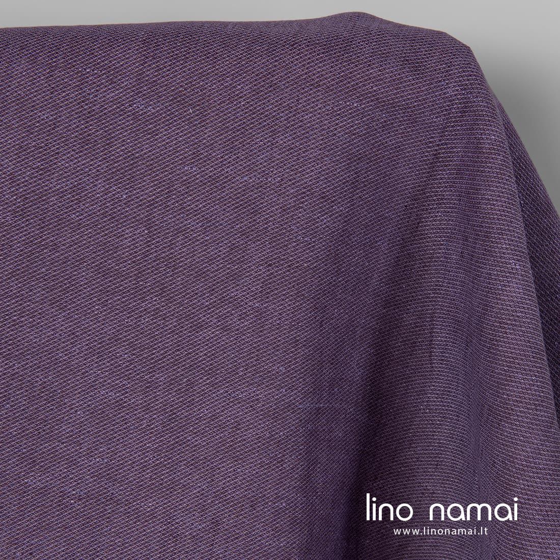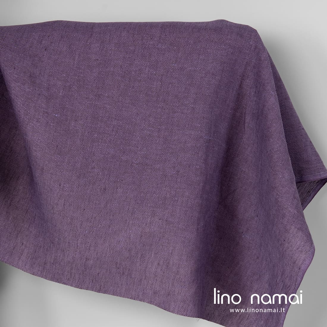 Violetinis raštuotas lininis audinys išaustas smulkiu raštu iš šviesiai ir tamsiai violetinių verpalų. Tvirtas, tankus, vidutinio storio, tinka drabužiams ir namų tekstilei siūti.