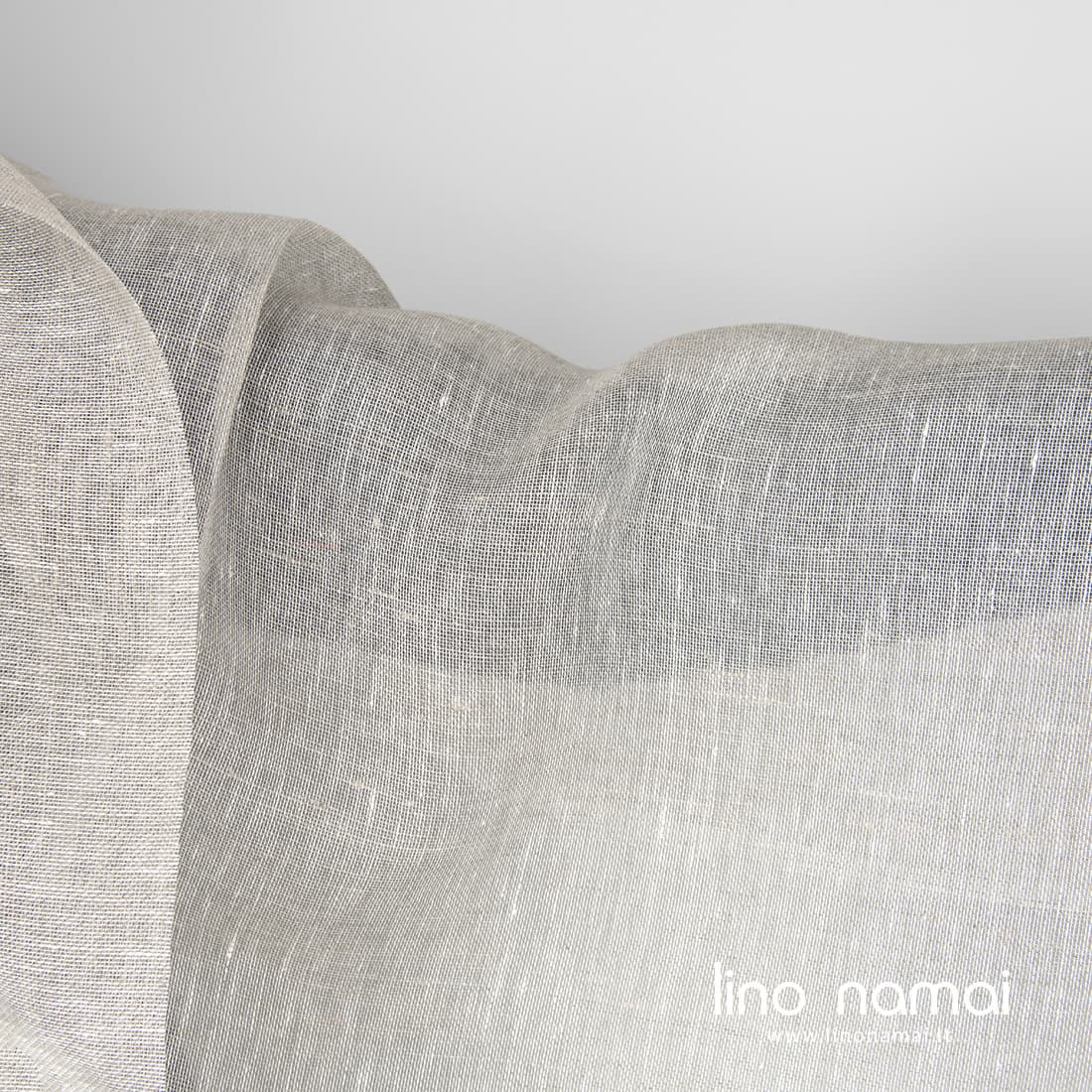Permatomas šviesiai pilkos ir baltos spalvų margas lininis audinys, austas drobinio pynimo raštu. Itin retas, plonas, peršviečiamas ir lengvas audinys puikiai tiks šalikams, užuolaidėlėms ir aksesuarams kurti.