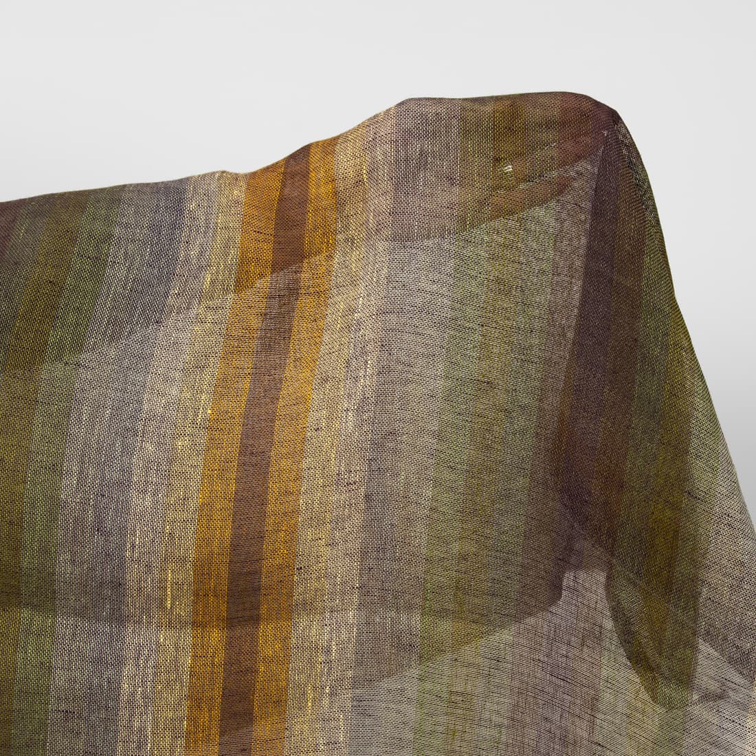Violetinių, rudų, gelsvų, žalsvų ir melsvų atspalvių dryžuotas lininis audinys. Ypatingai retas, plonas, permatomas ir lengvas. Puikiai tiks šalikams, aksesuarams, užuolaidėlėms, interjero dekorui.