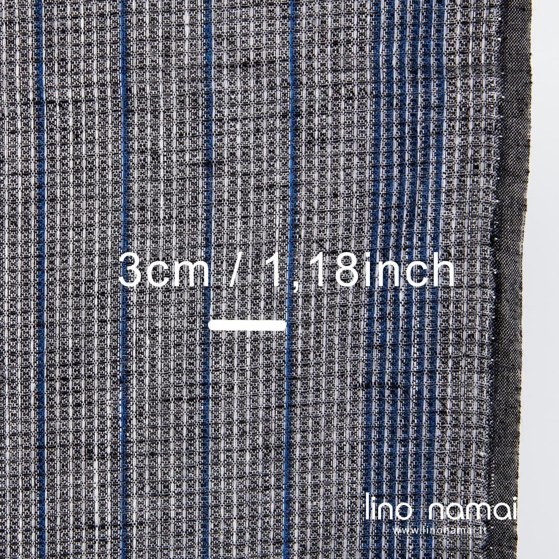 Juodas lininis audinys „vaflinis“ mėlynai dryžuotas. Suausti juodi ir balti verpalai sukuria melanžinį efektą. Audinys tvirtas, tankus, vidutinio storio, 60cm pločio - puikai tinka virtuvės rankšluosčiams siūti.