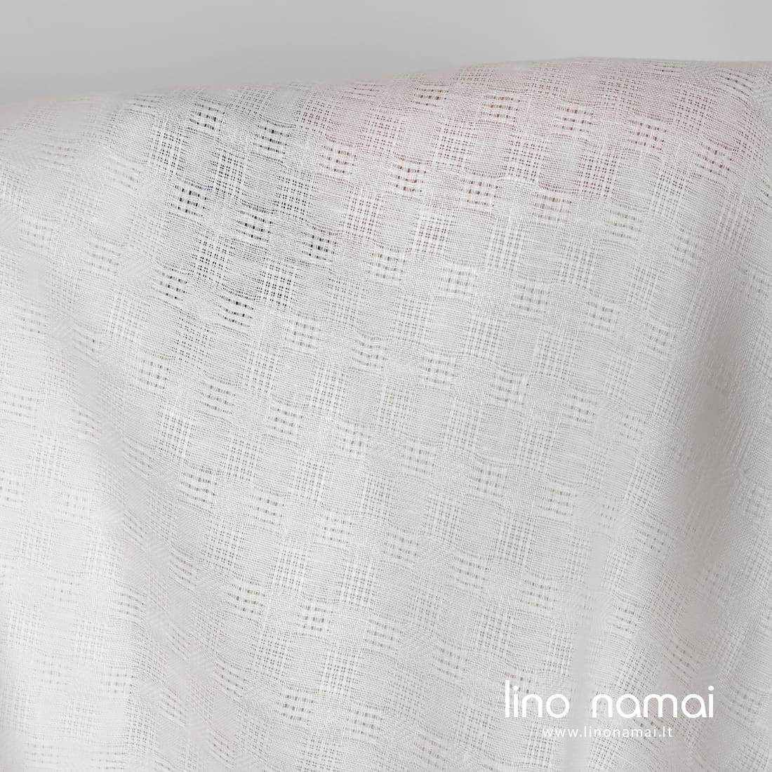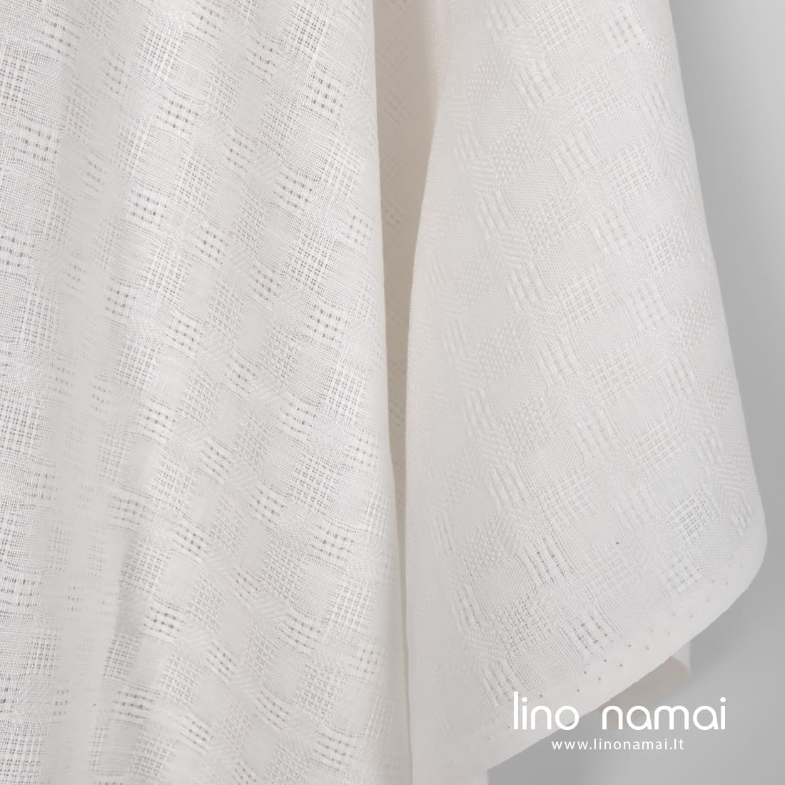 Lininis audinys gelsvai baltas (pieno baltumo) ažūriniais ir tankaus pynimo langeliais. Tvirtas, vidutinio storio, tinkamas dekoratyvioms staltiesėms, servetėlėms, užuolaidoms, patalynei ir drabužiams siūti.