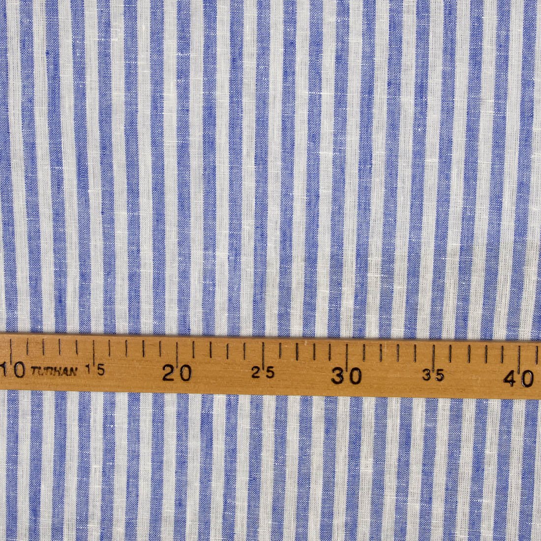 Lininis audinys baltas (pieno baltumo, gelsvai baltas) mėlynai dryžuotas, siauras (50cm pločio), tvirtas, tankus, patvarus. Vertikalių juostelių plotis 0,7cm.