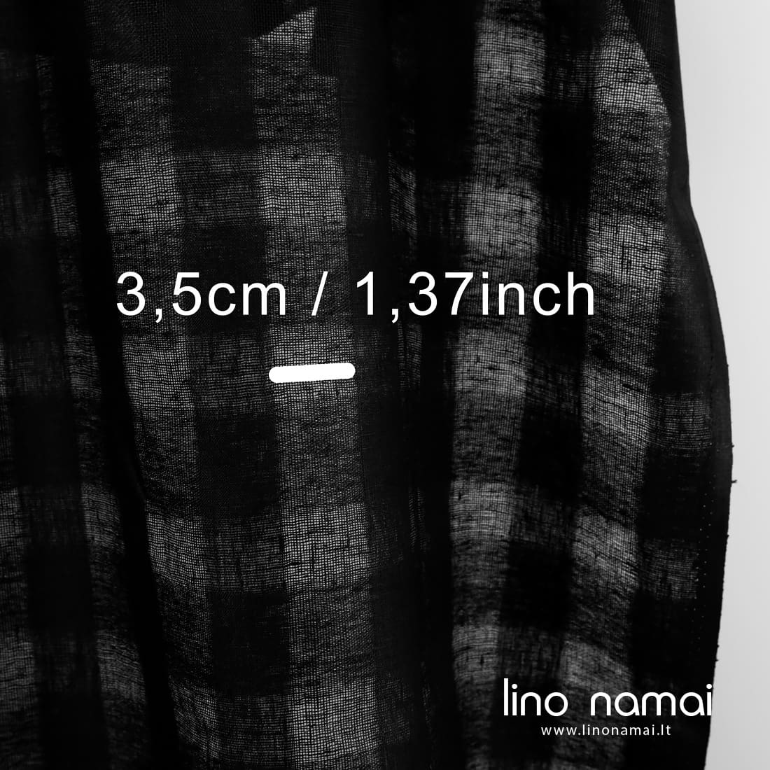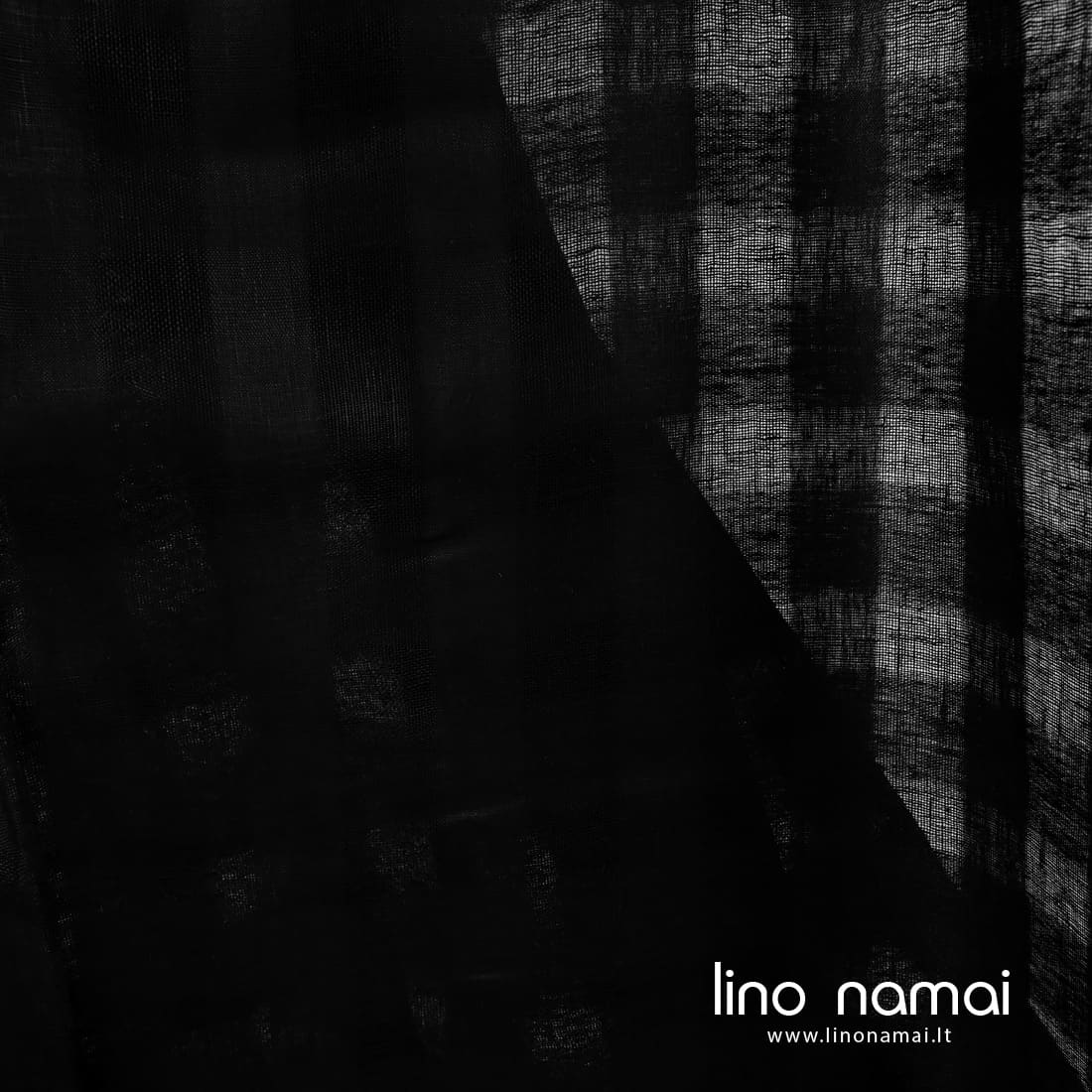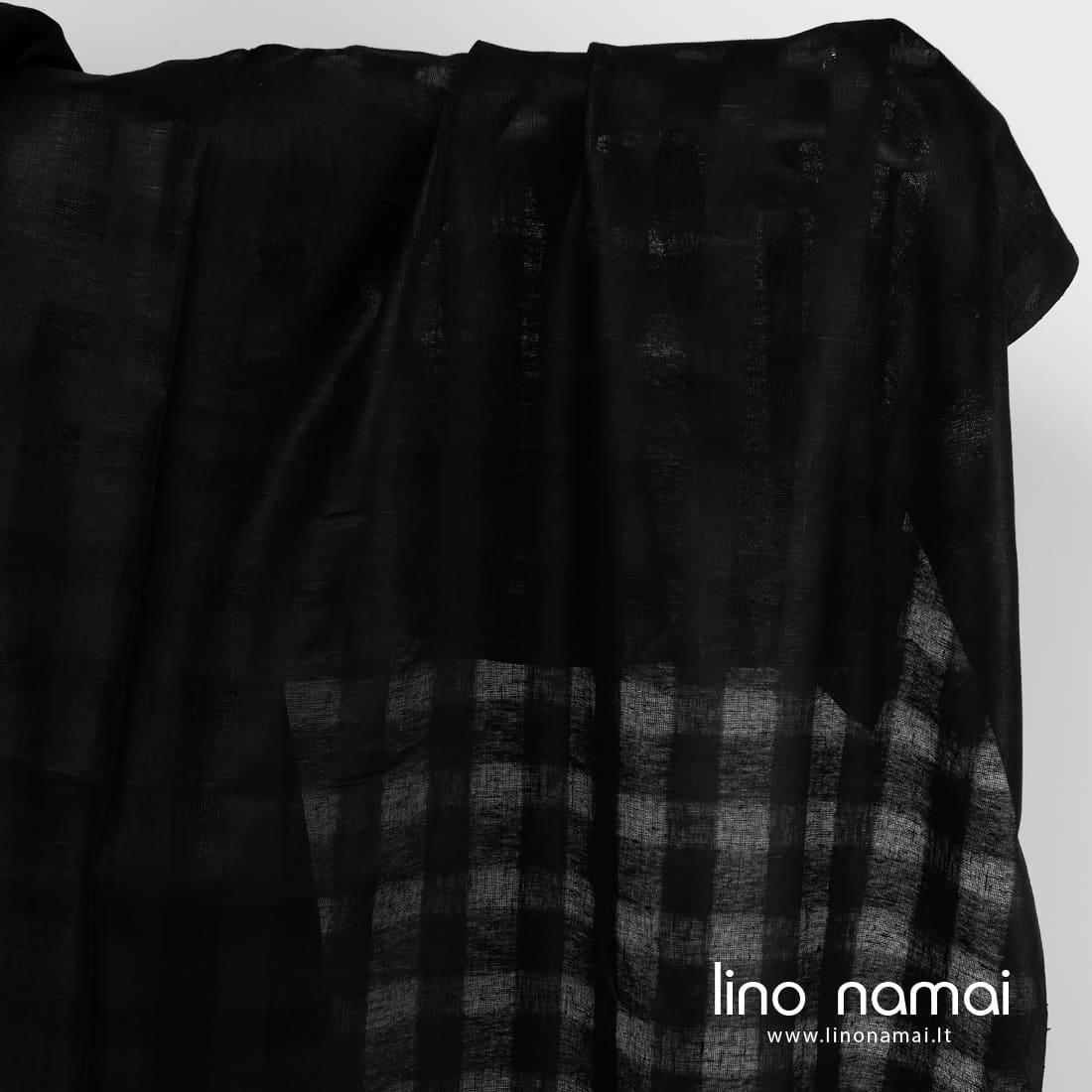 Lininis audinys juodas permatomas languotas: austas retomis ir šiek tiek tankesnėmis juostomis, sudarančiomis langelius. Tvirtas, vidutinio storio. Tinkamas šalikams, užuolaidoms siūti.