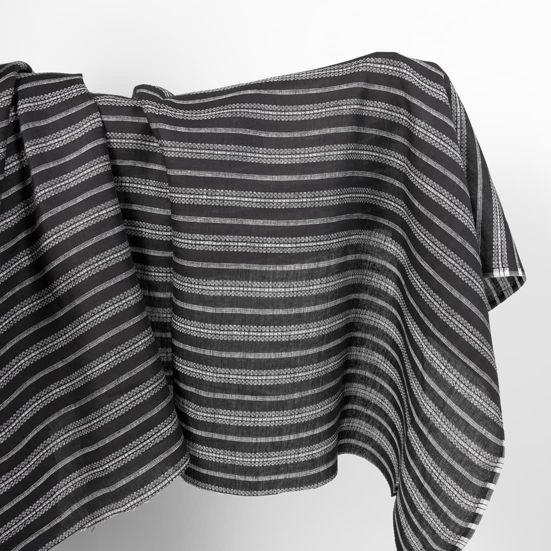 • Juodas lininis audinys su horizontaliomis baltomis raštuotomis juostelėmis