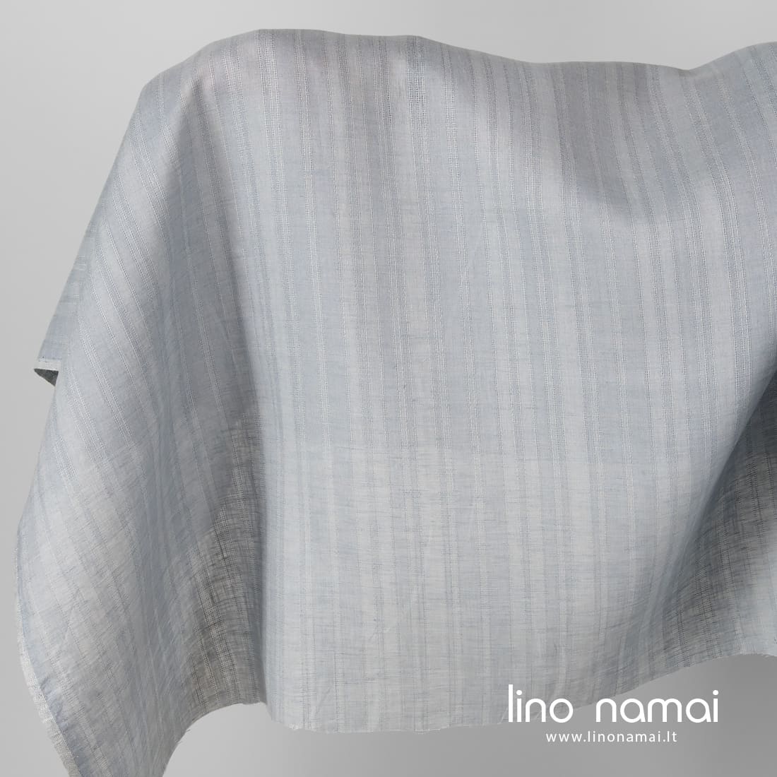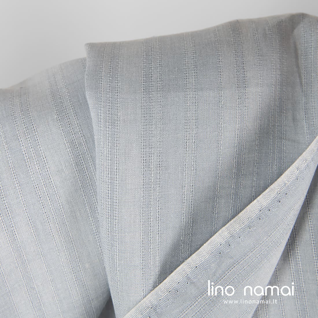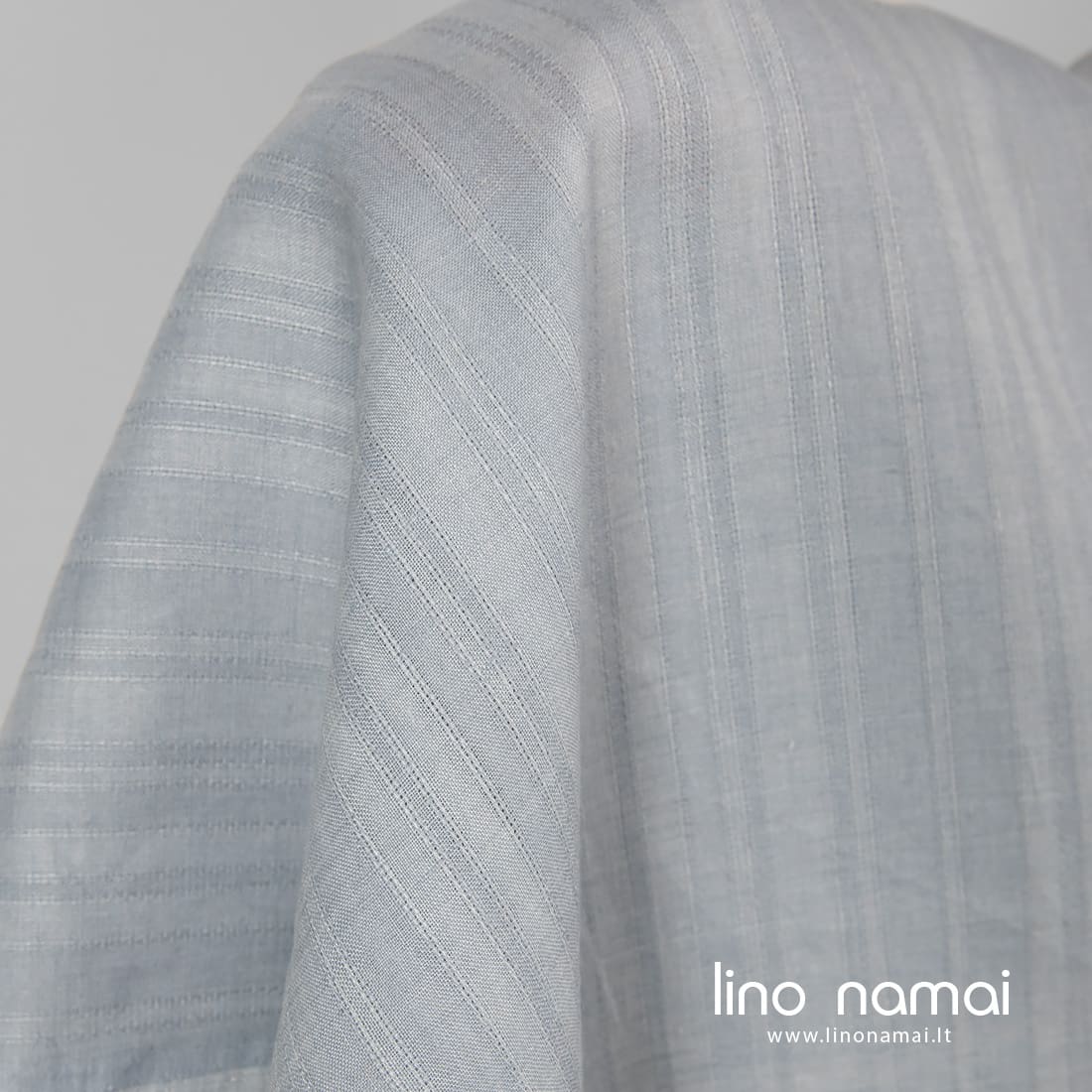 Lininis audinys vertikaliais dviejų atspalvių melsvai pilkais dryžiais ir juos skiriančiomis ažūrinėmis juostelėmis. Tinka drabužiams, užuolaidoms, staltiesėms, servetėlėms siūti.