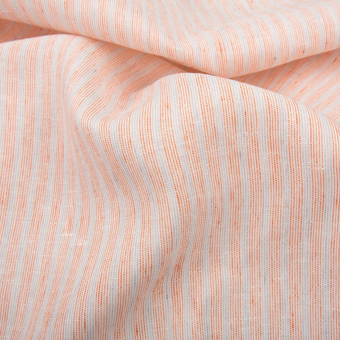 Lininis audinys oranžiniais ir pilkšvais vertikaliais dryžiais, kurių plotis 1cm ir 0,5cm. Tvirtas, tankus, patvarus, tinkamas drabužiams ir namų tekstilei siūti.