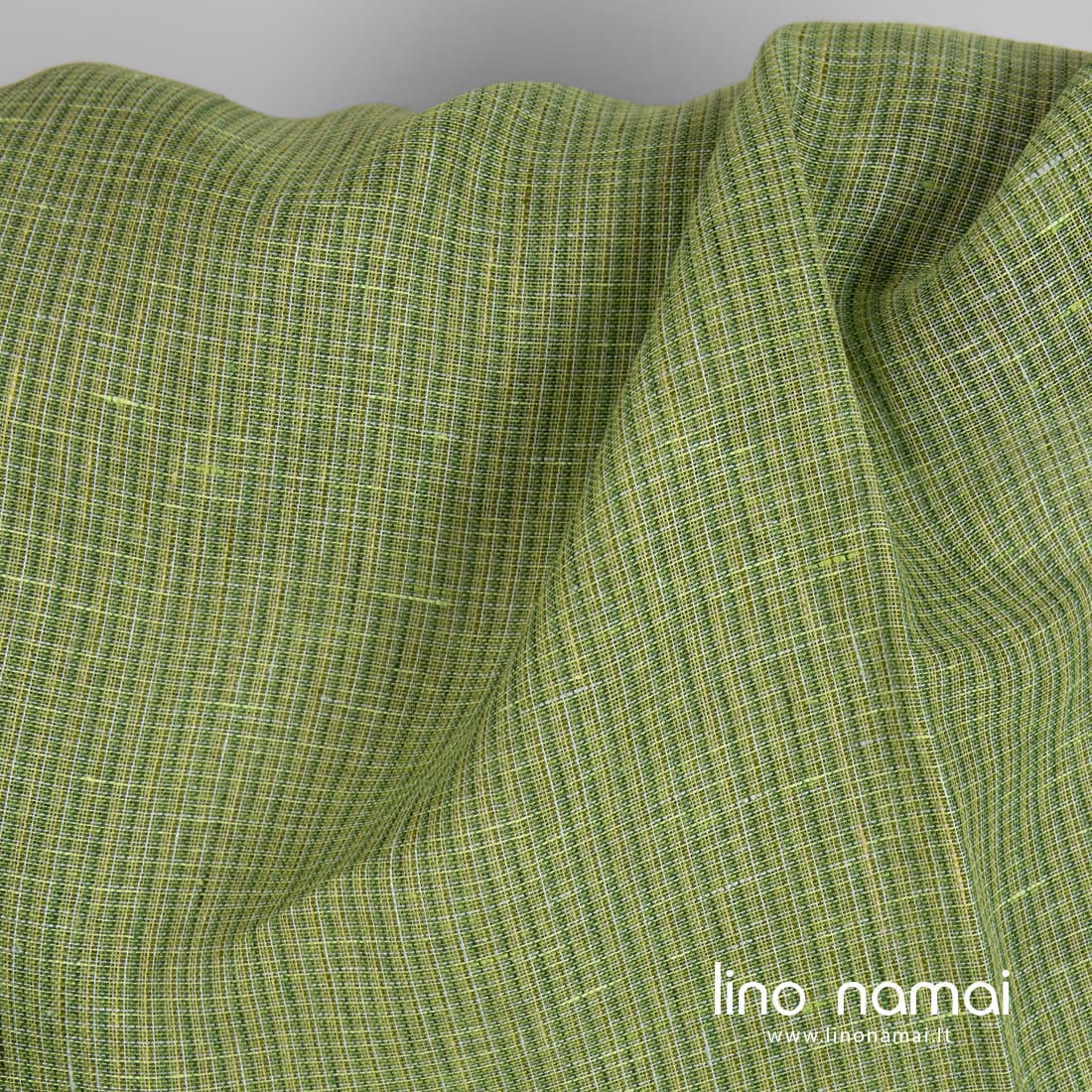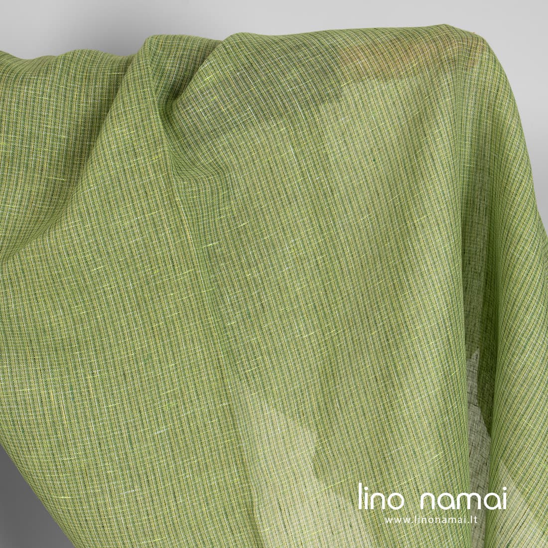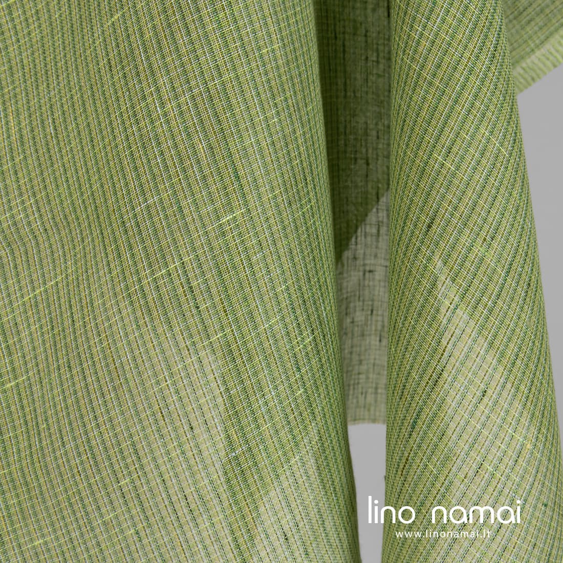 Lininis audinys permatomas žaliais langeliais. Audinyje suausti kelių atspalvių žali verpalai: spalvos nuo salotinės iki tamsiai žalios. Lengvas, retas lino audinys užuolaidoms, šalikams siūti.