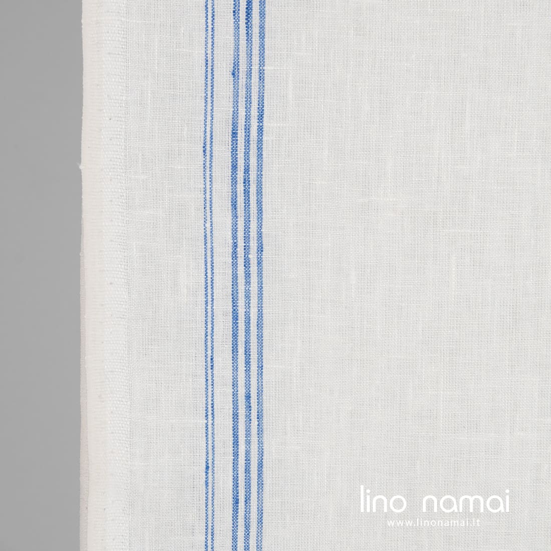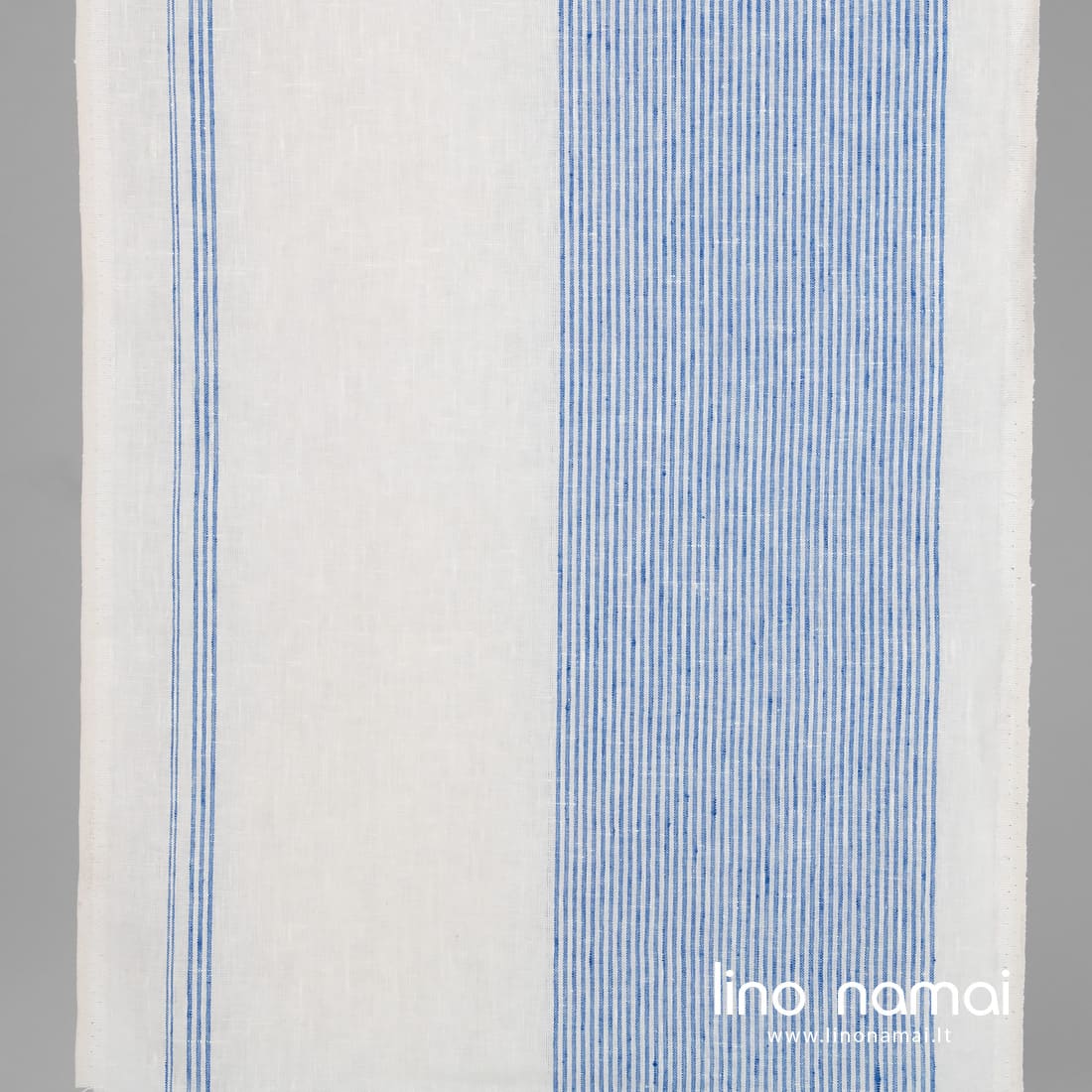 • Lininis rankšluostinis audinys mėlynomis juostelėmis pieno baltumo fone
