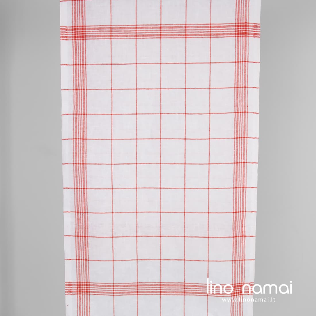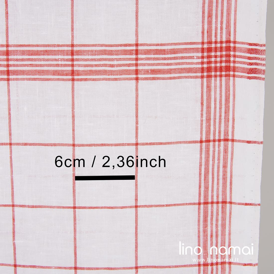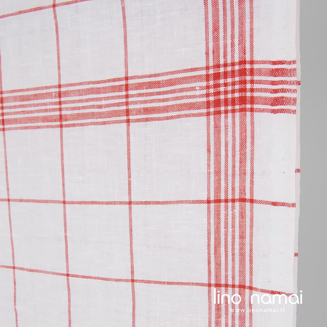 • Lininis audinys raudonai-baltai languotas virtuvės rankšluostukams siūti