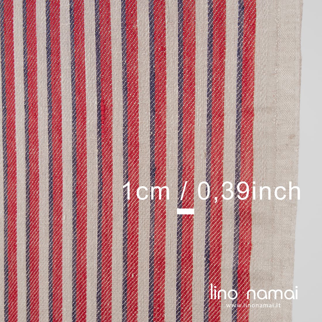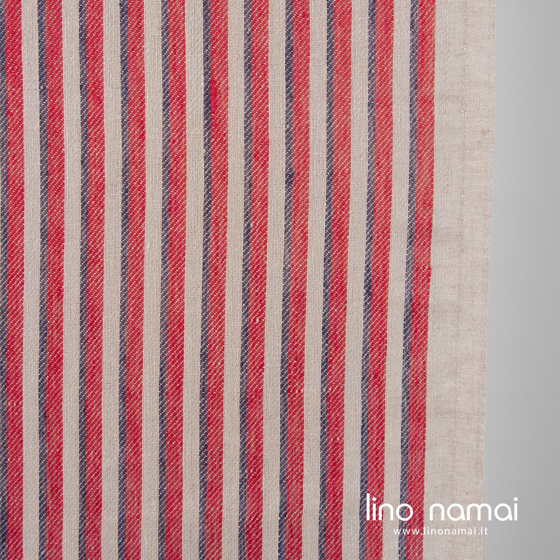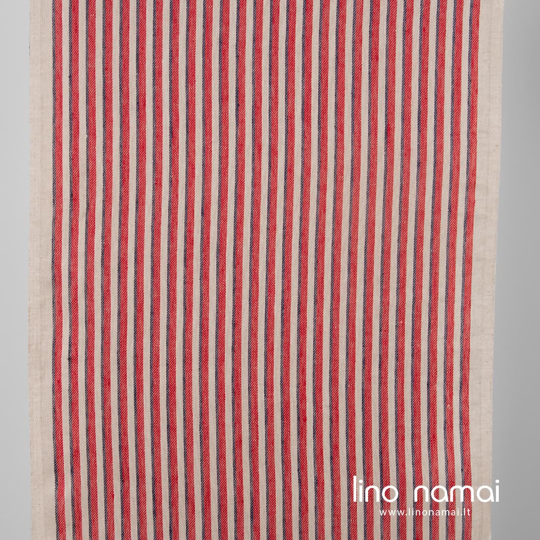 • Rusvas lino audinys raudonais ir tamsiai mėlynais vertikaliais dryžiais