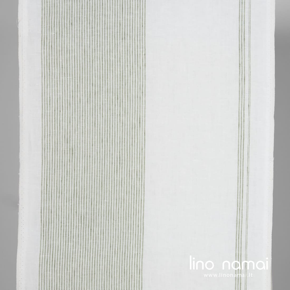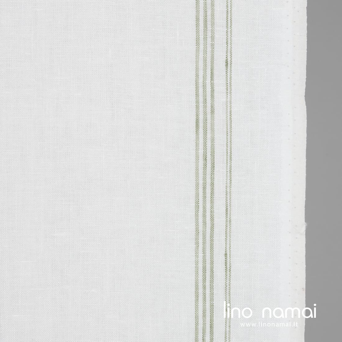 Lininis audinys rankšluostinis žalsvomis juostelėmis pieno baltumo (gelsvai baltame) fone. Tvirtas, tankus, vidutinio storio, puikiai sugeriantis drėgmę, 50cm pločio - dėl šių savybių idealus virtuvės rankšluostukams siūti.