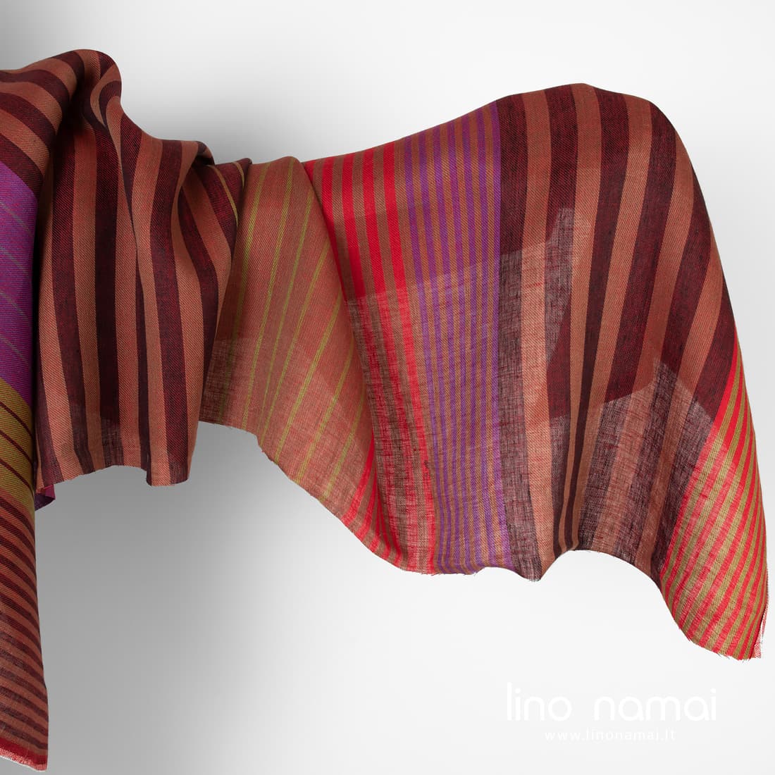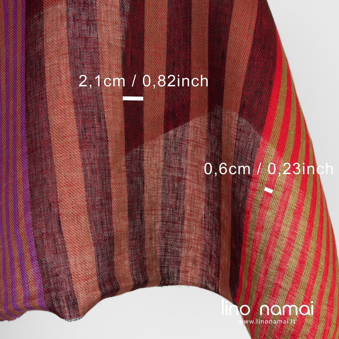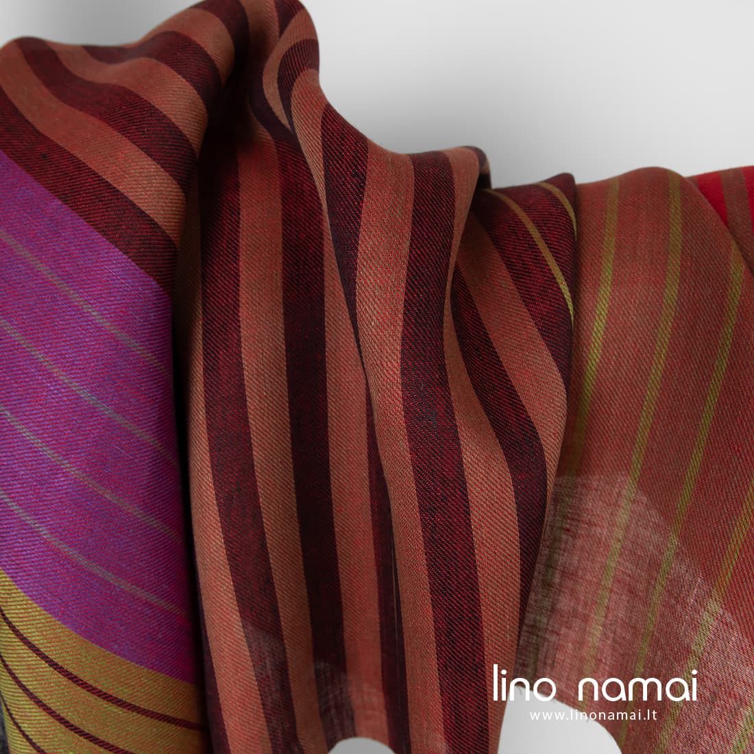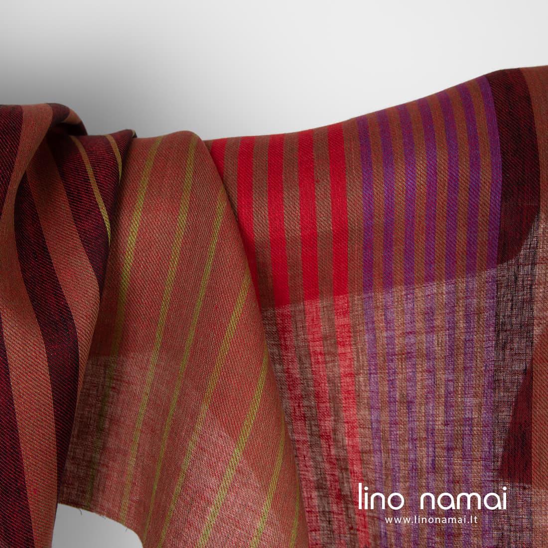 • Lininis audinys raudonų atspalvių dryžiais