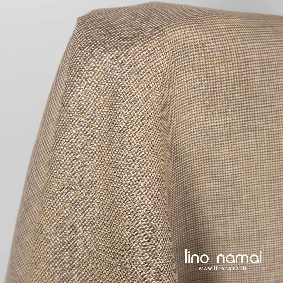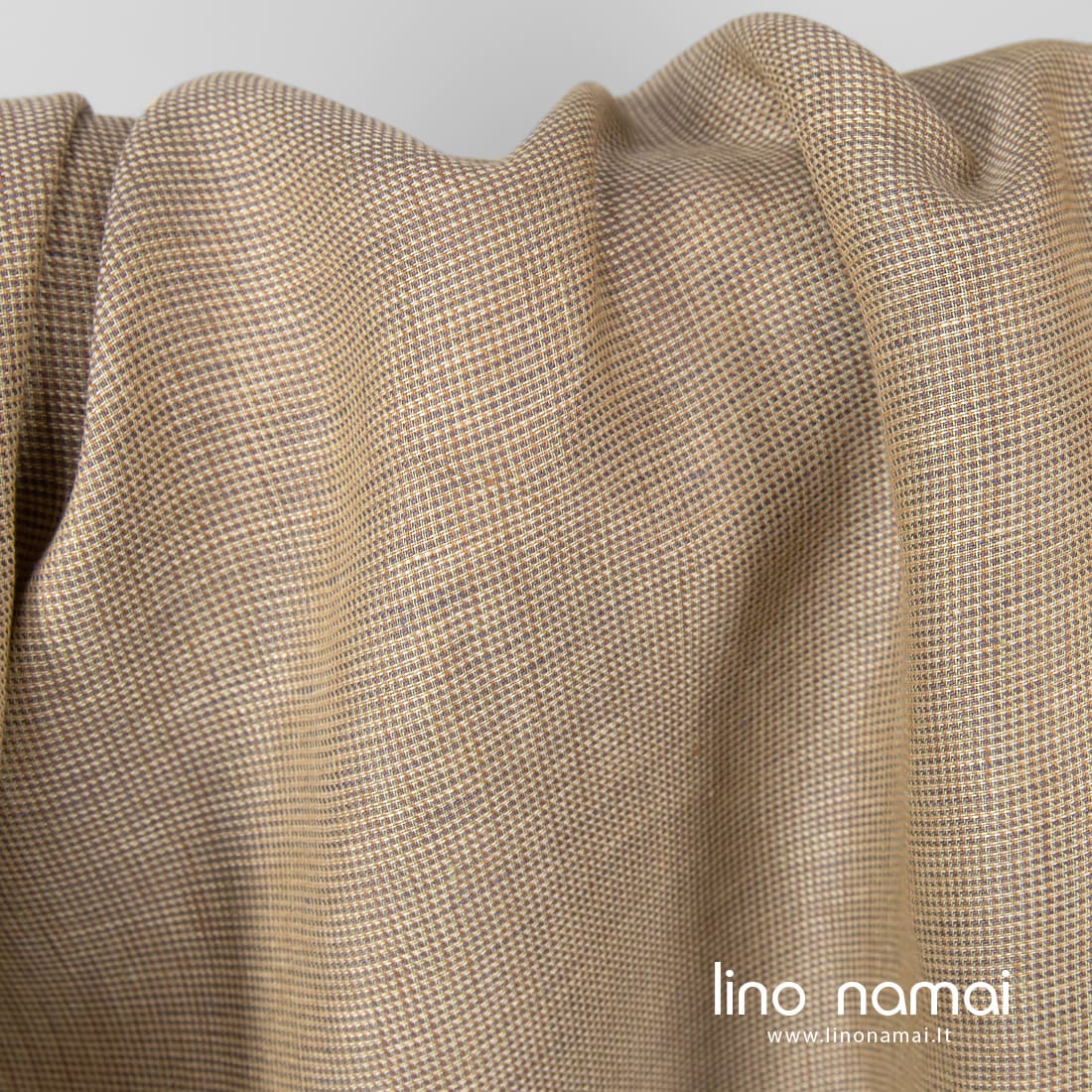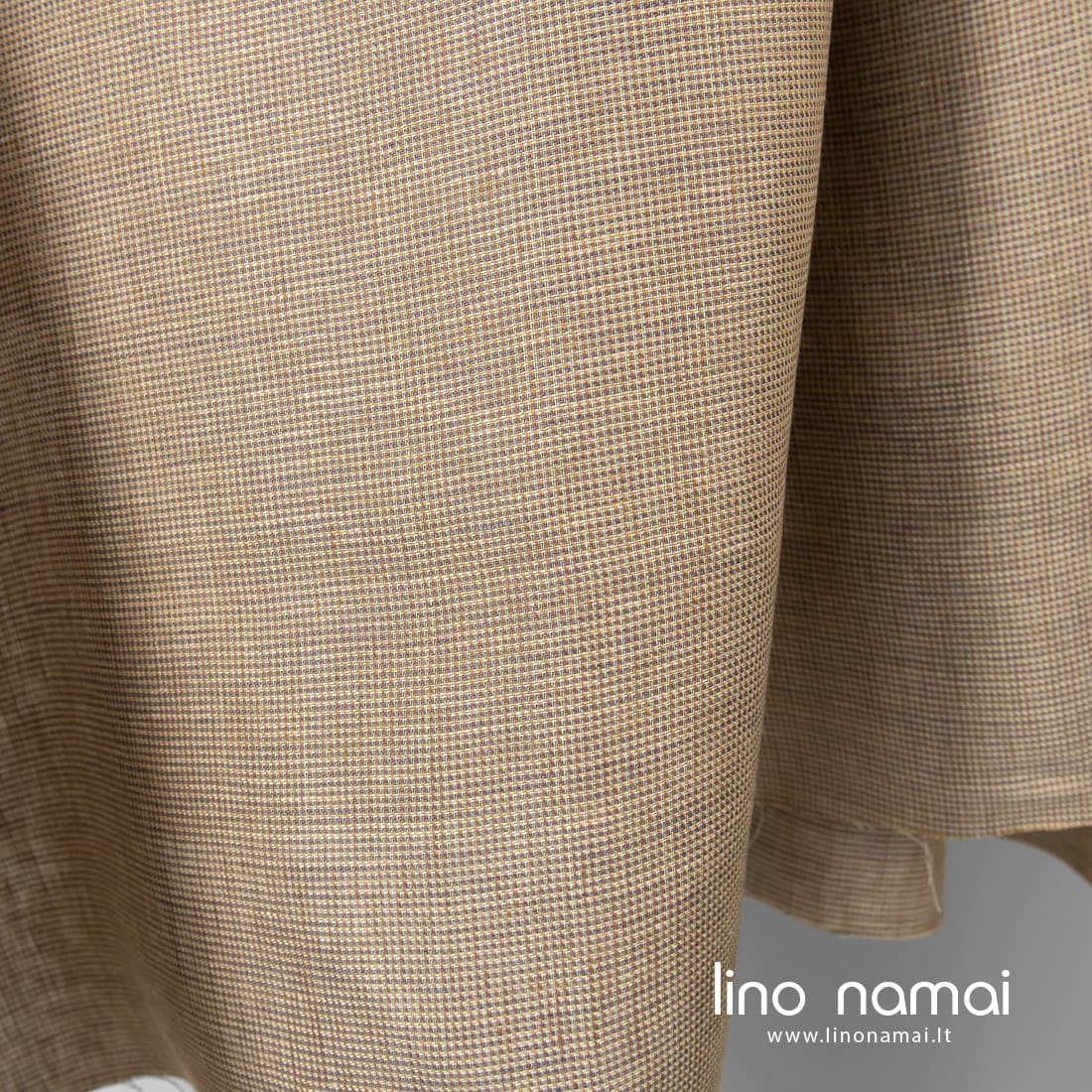 Lininis audinys smulkiais rudais langeliais. Šiame tankiame, tvirtame, vidutinio storio lino audinyje suaudėme šviesiai rudus, smėlio spalvos (gelsvai rusvus), violetinius ir šviesiai žalius verpalus. Jis tinka drabužiams, patalynei, staltiesėms, servetėlėms siūti.