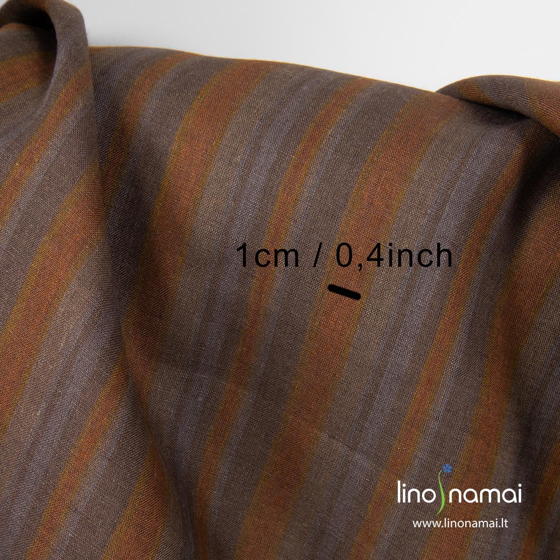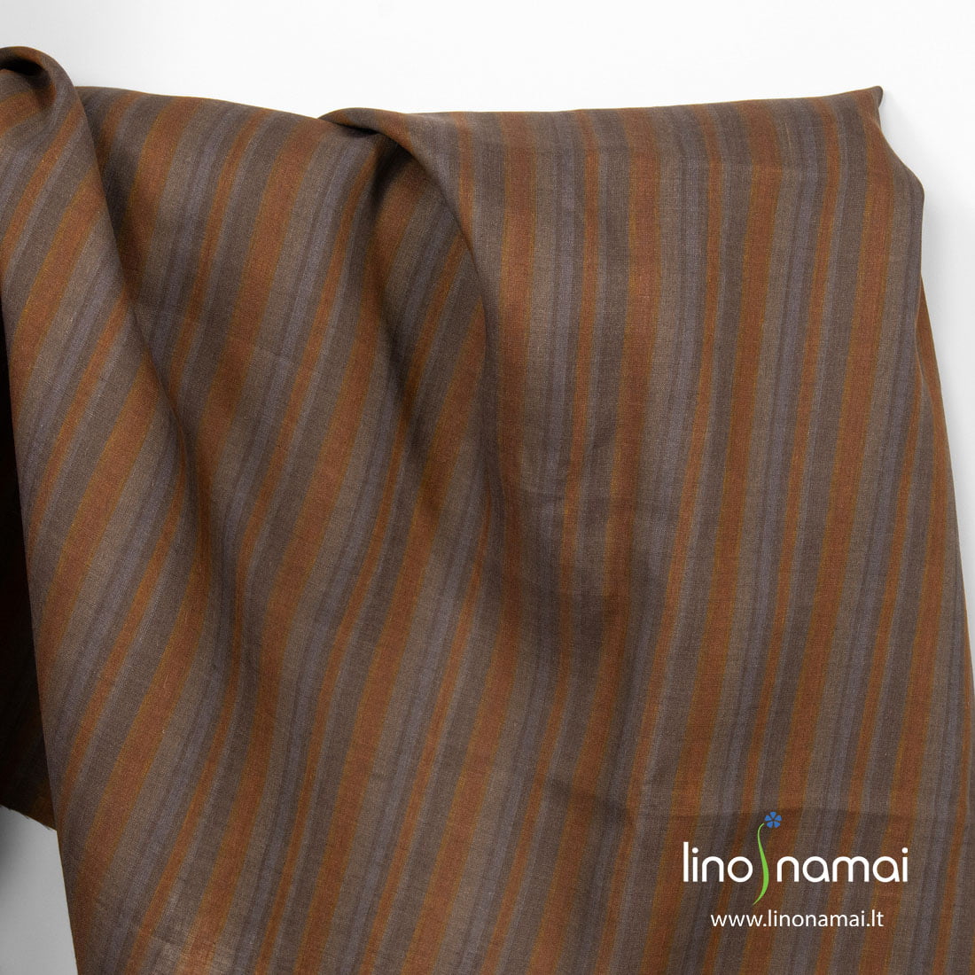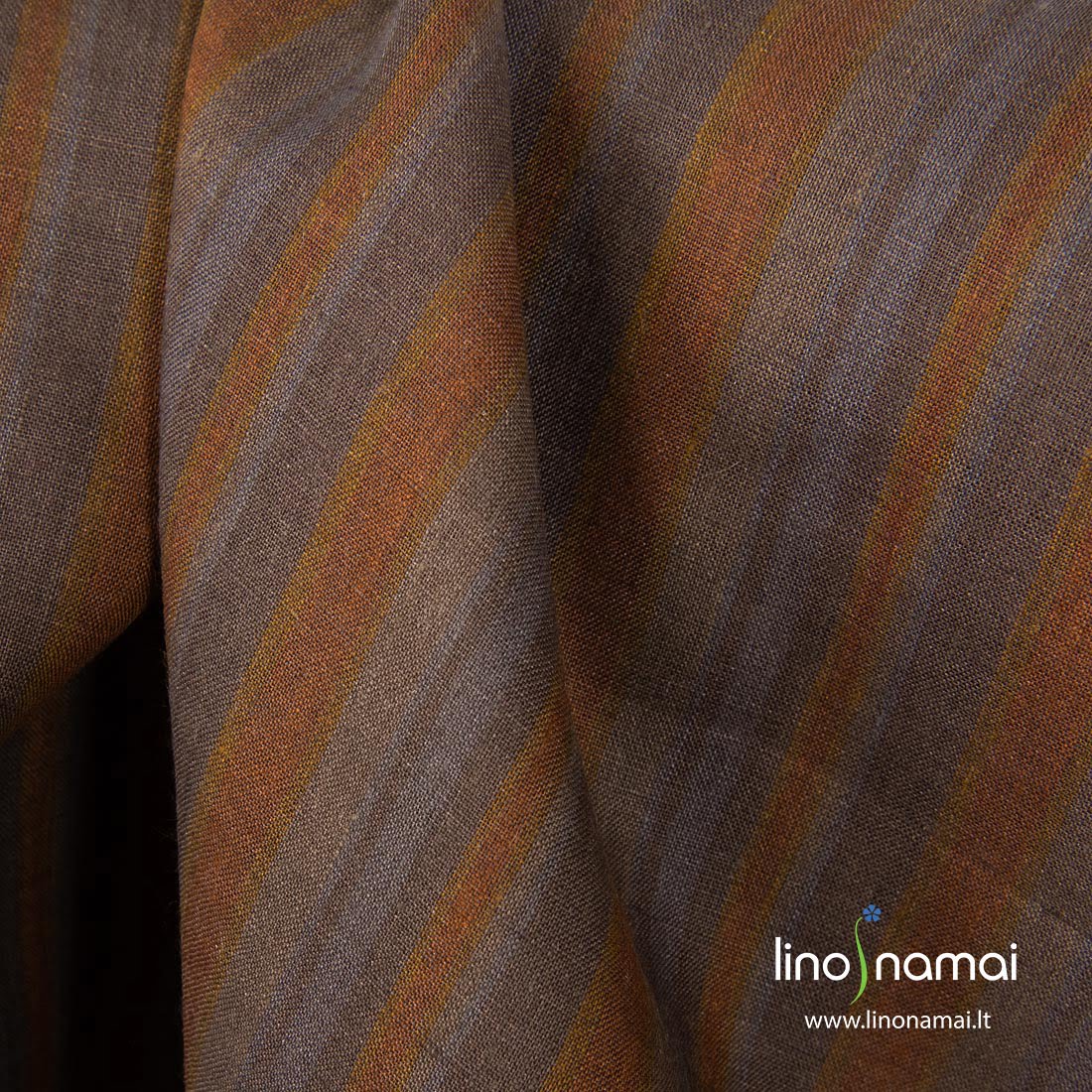 Lininis audinys šviesiai, tamsiai ir pilkai rudomis vertikaliomis įvairaus pločio juostomis. Šis linas tvirtas, tankus, lengvas, vidutinio storio. Tinka namų tekstilei ir drabužiams siūti.