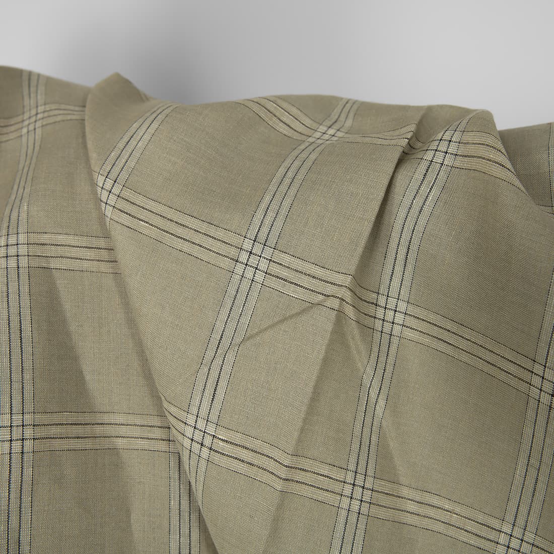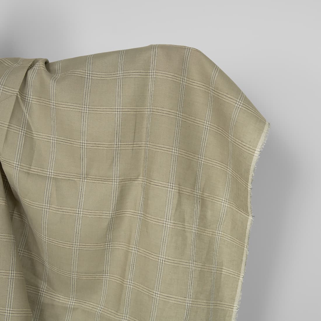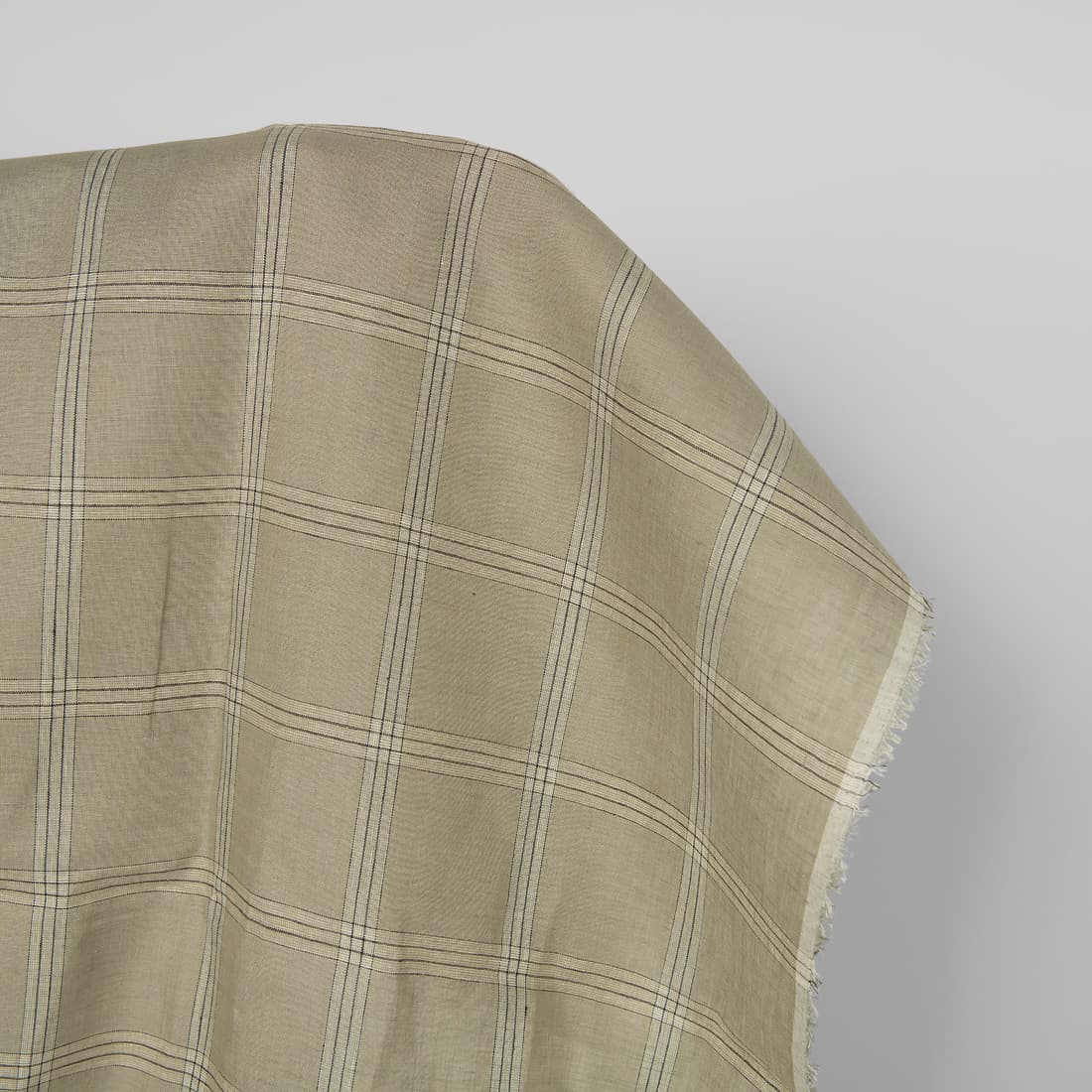 • Lininis audinys languotas, kuriame suausti gelsvai rusvi, šviesiai pilki, grafito pilkos ir vanilės spalvos (gelsvi) verpalai