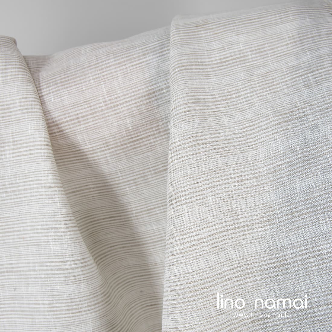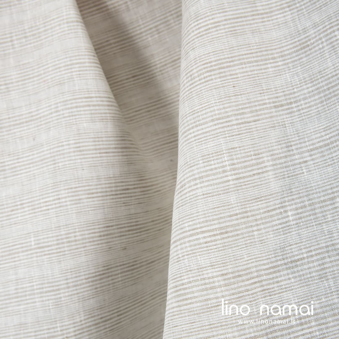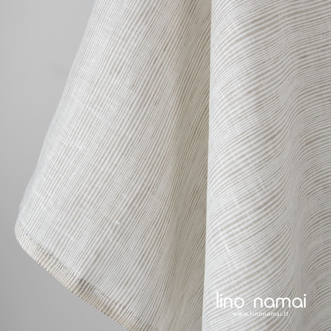 Lininis audinys horizontaliais siaurais smėlio spalvos (pilkai rusvais) dryžiais pieno baltumo (gelsvai baltame) fone yra lengvas, tankus, tvirtas. Tinka namų tekstilei ir drabužiams siūti.