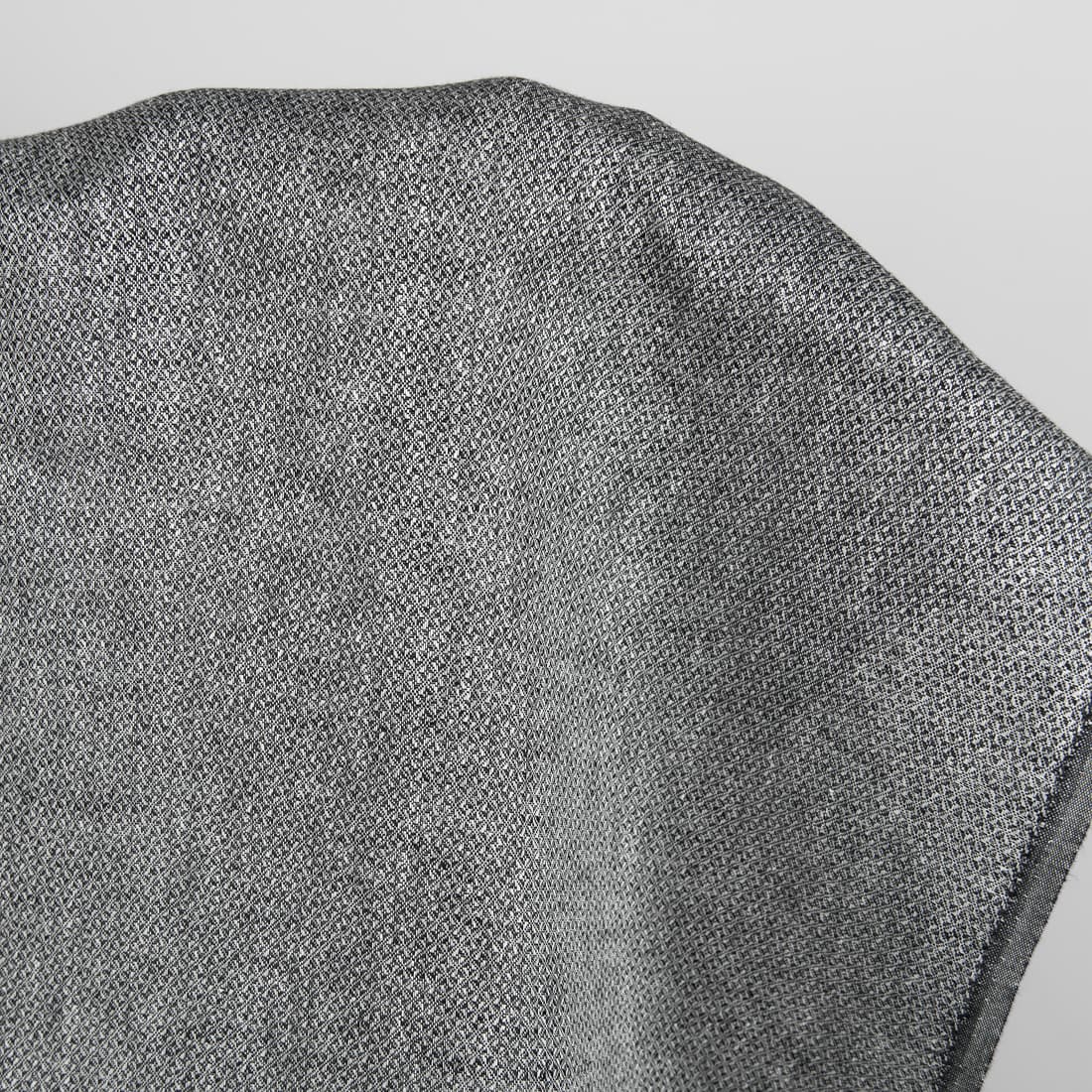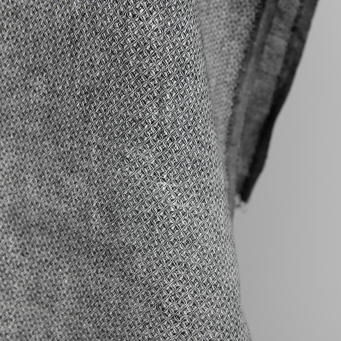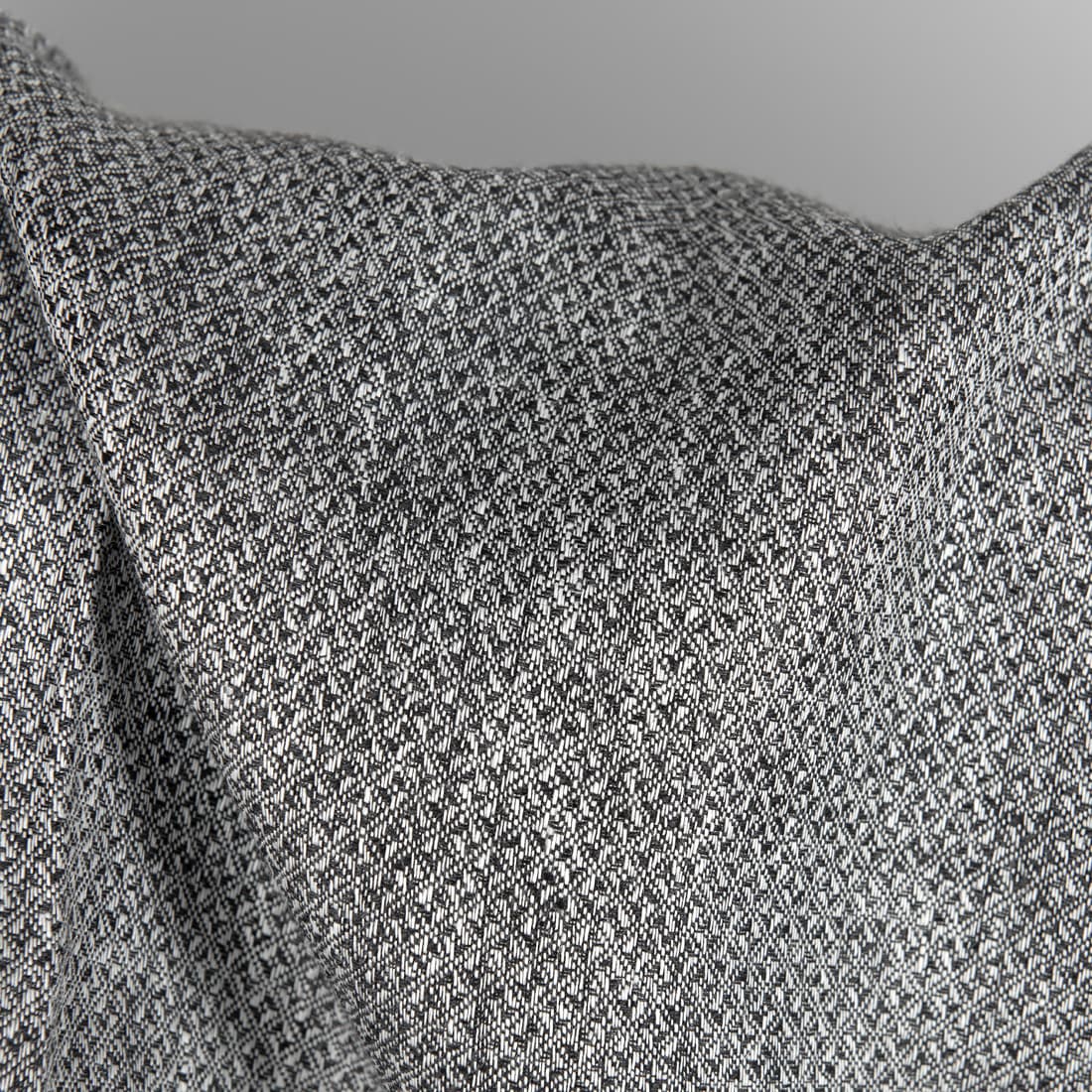 Raštuotas 100% lininis audinys. Smulkus rombų raštas austas iš juodų ir baltų verpalų. Tvirtas, vidutinio storio, tankus audinys.