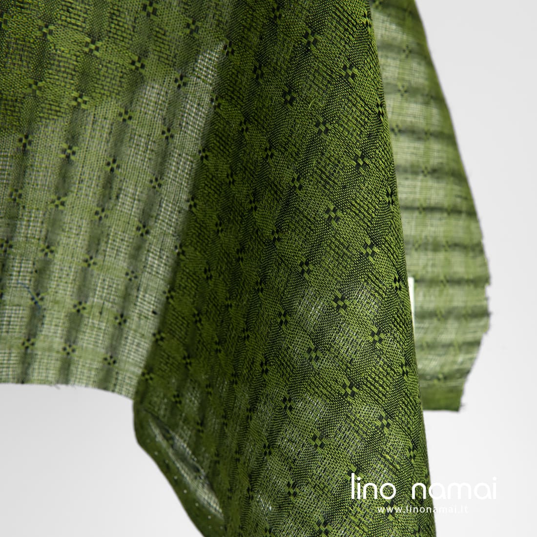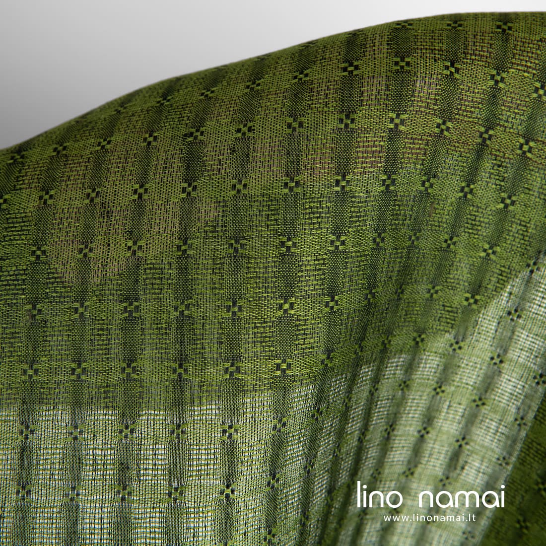 • Lininis audinys ažūriniais langeliais išaustas iš šviesiai žalių ir juodų verpalų