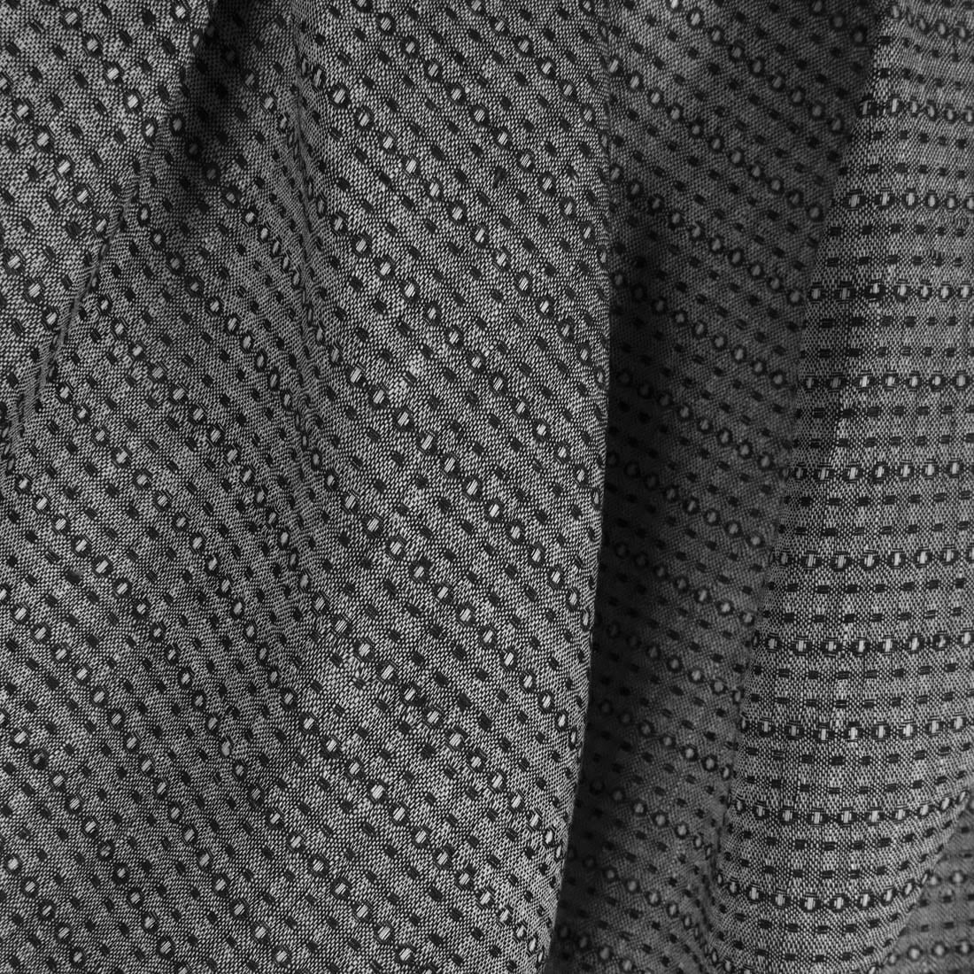 Lininis juodai - baltai raštuotas audinys su horizontaliomis stilizuotų apskritimų ir brūkšniukų juostelėmis. Tankiai suaustas, tvirtas, vidutinio storio.
