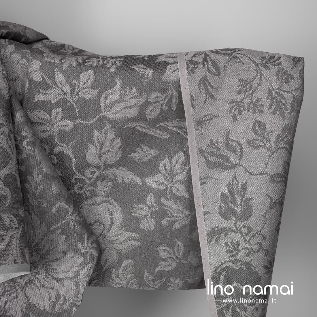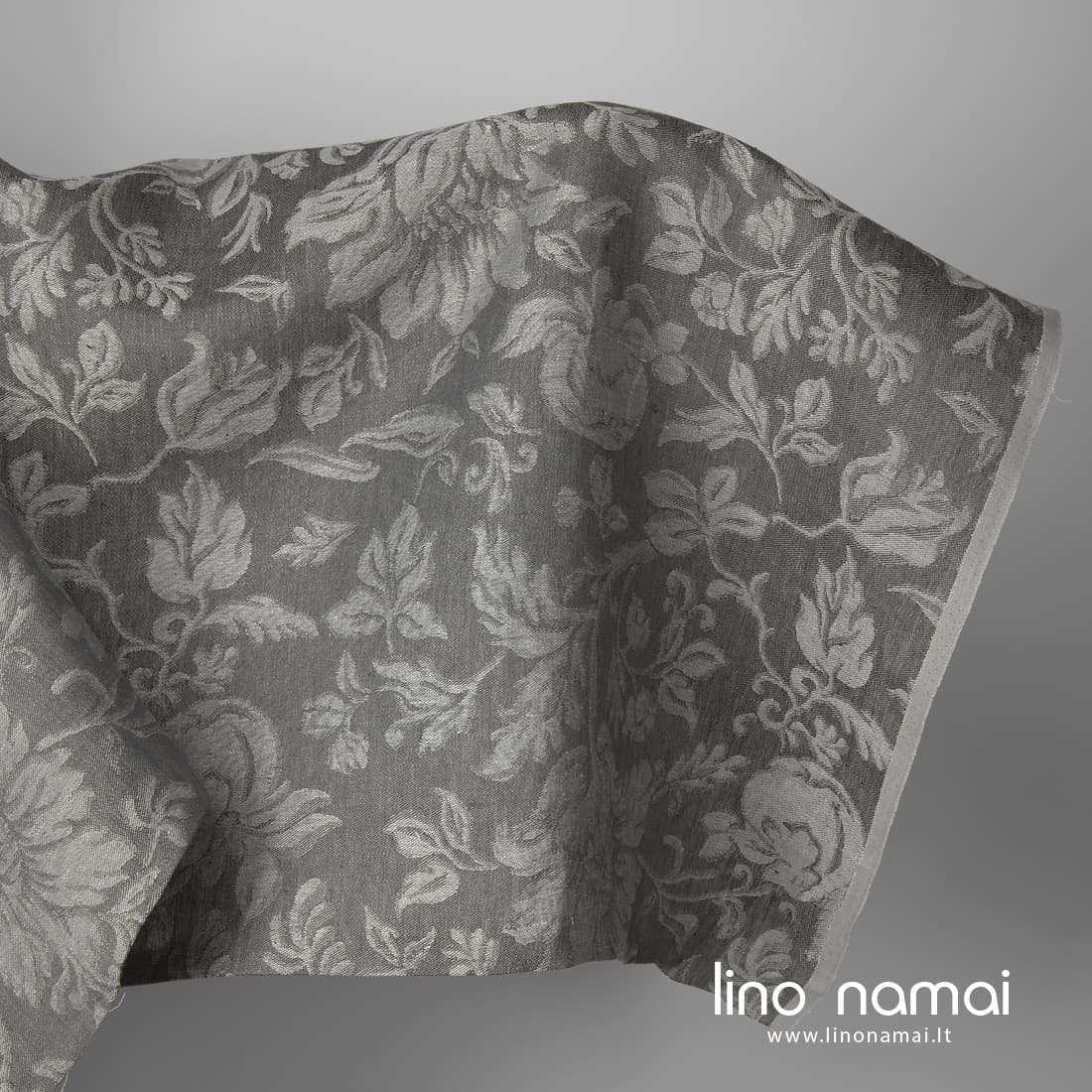 • Lininis žakardinis pilkas audinys gėlių raštu