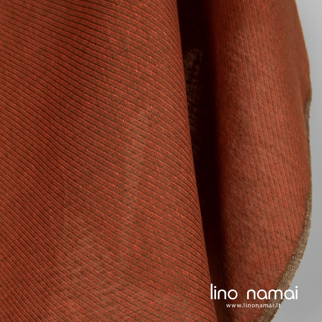 Lino audinys oranžiniais dryžiais, einančiais audinyje skersai, išaustas oranžinius verpalus derinant su rudos spalvos verpalais. Tvirtas, tankus, vidutinio storio. Šis audinys tinka drabužiams ir namų tekstilės gaminiams siūti.
