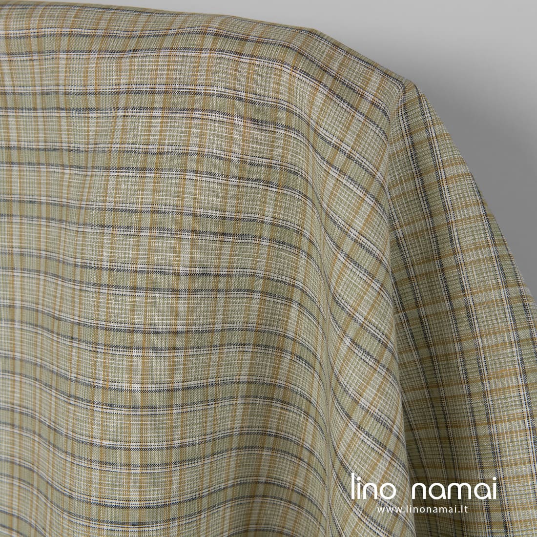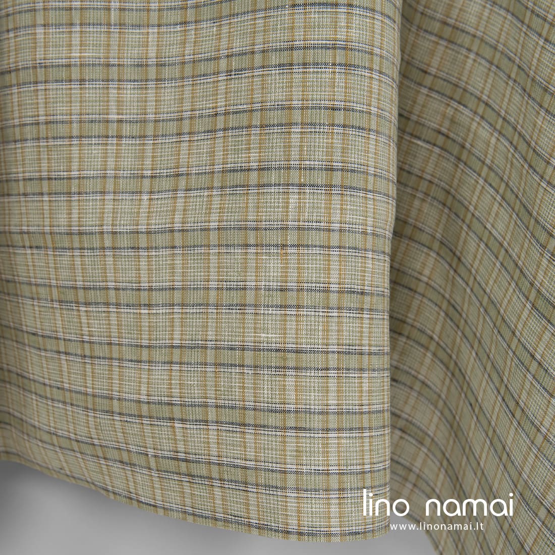 Lino audinys žaliais langučiais. Šiame lengvame, tankiame, vidutinio storio lino audinyje suausti sendintos žalios, rusvai geltonos, tamsiai mėlynos spalvos ir pieno baltumo (gelsvai balti) verpalai. Tinka drabužiams ir namų tekstilei siūti.