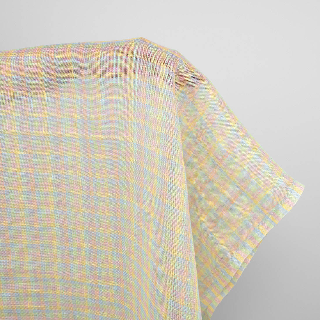 Lengvas, permatomas, reto audimo 100% lininis audinys. Langeliai išausti naudojant šviesių, blyškių, pastelinių spalvų verpalus: alyvinius, žydrus, salotinius, rožinius, geltonus. Langelių dydis 0,6cm x 0,6cm.