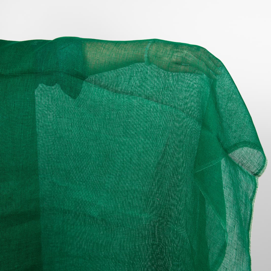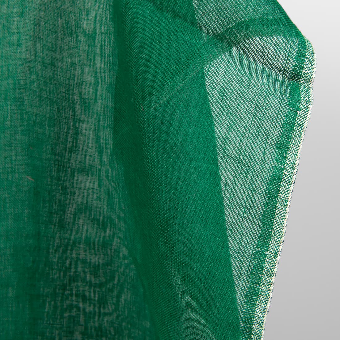 Permatomas lininis ryškiai žalios spalvos audinys. Ypatingai retas, plonas, kokybiškas ir lengvas. Puikiai tiks šalikams, aksesuarams, užuolaidėlėms, interjero dekorui.