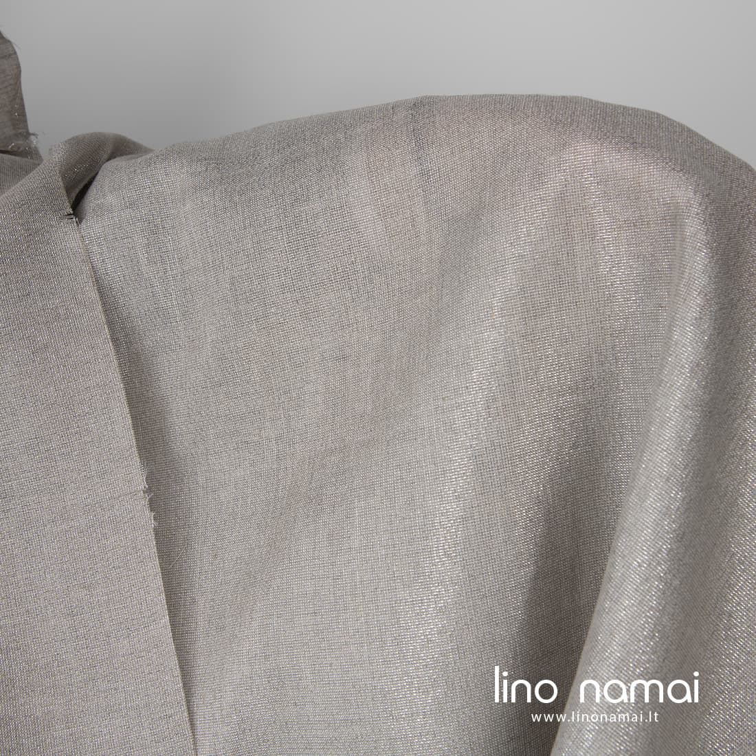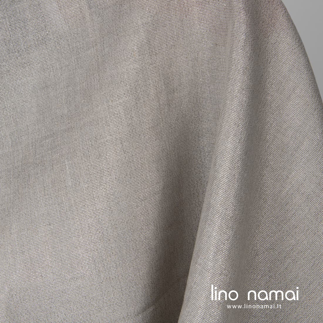 - Spalva: išaustas iš natūralios spalvos (nedažytų, rusvai pilkšvų) lino ir sidabro spalvos poliesterio verpalų, melanžas
