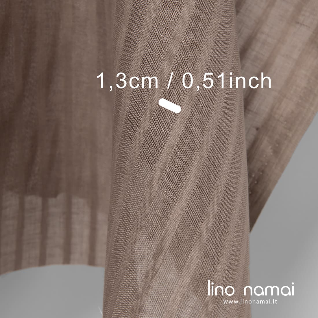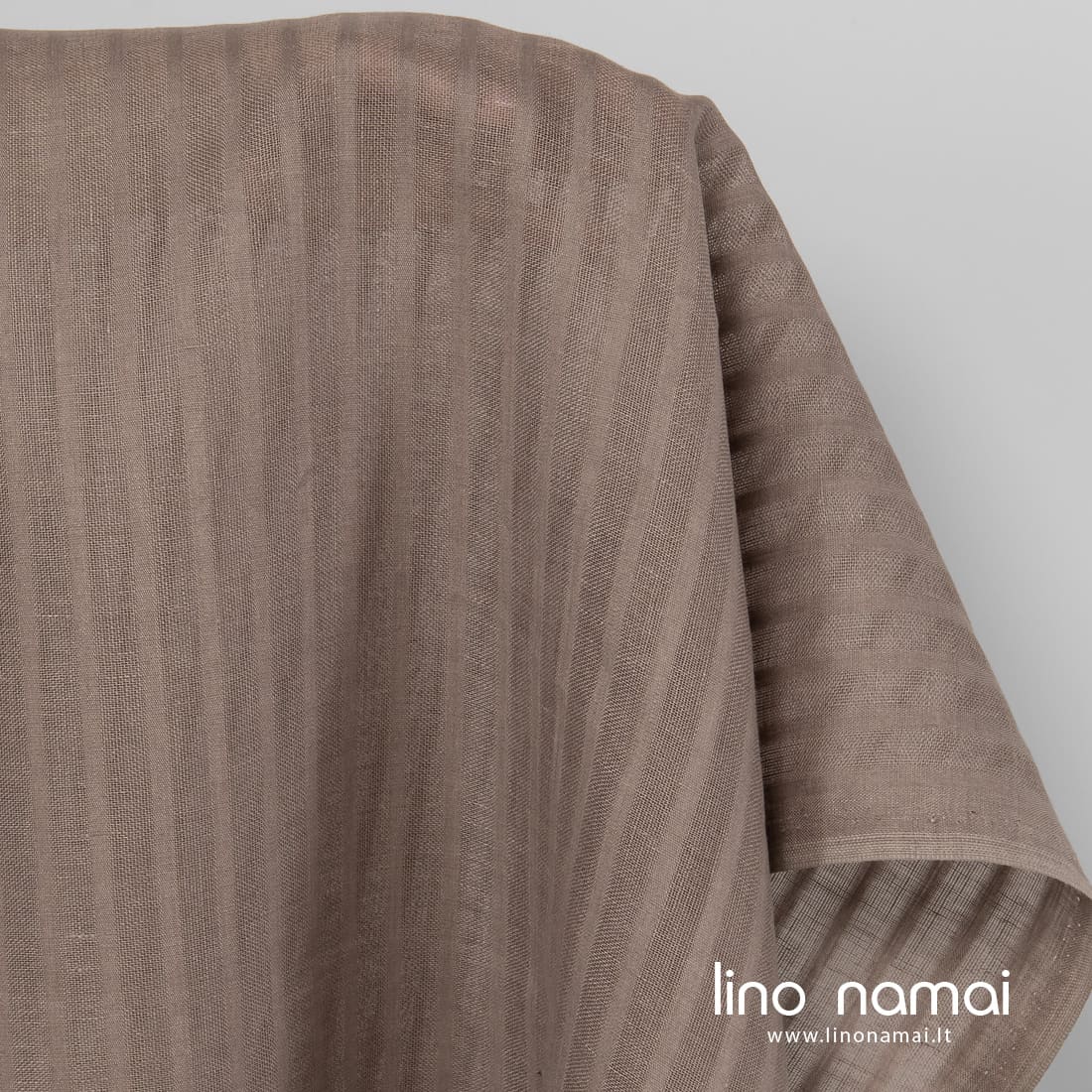 Rusvai pilkas lininis audinys ažūrinėmis juostelėmis, išaustomis audinyje vertikaliai. Šis linas lengvas, tinkamas namų tekstilei siūti.