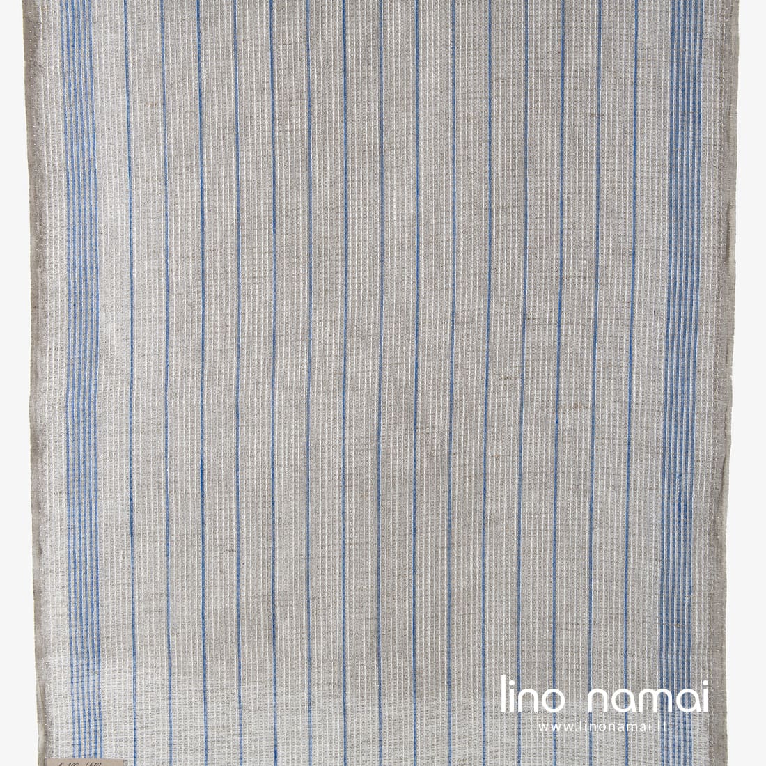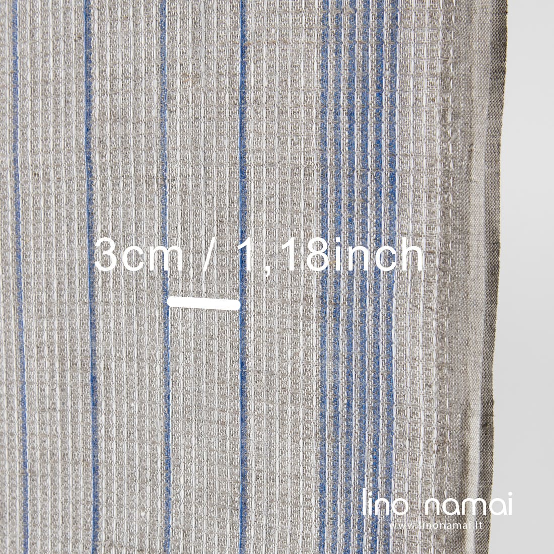 Pilkas lininis audinys „vaflinis“ mėlynai dryžuotas. Šį rankšluostinį liną išaudėme iš baltų, šviesiai mėlynų ir natūralios spalvos (nedažytų, rusvai pilkų) verpalų. Tvirtas, tankus, vidutinio storio, 60cm pločio.